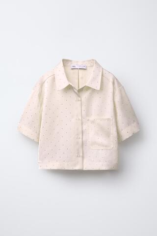 ZARA АТЛАСНАЯ РУБАШКА СО СТРАЗАМИ, СВЕТЛО-БЕЖЕВЫЙ