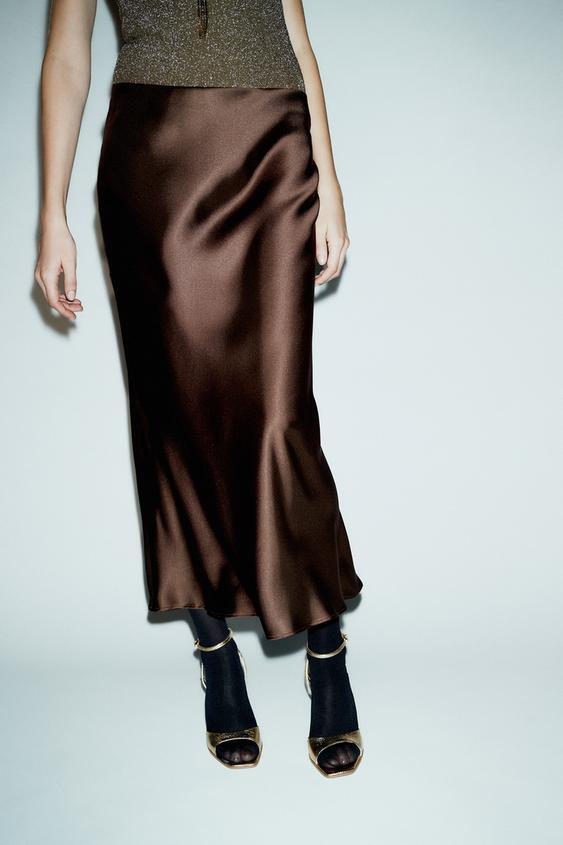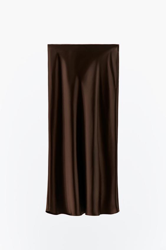 ZARA АТЛАСНАЯ ЮБКА МИДИ, КОРИЧНЕВЫЙ