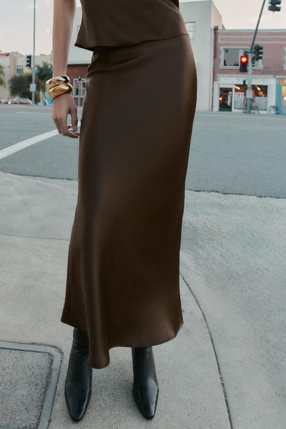 ZARA АТЛАСНАЯ ЮБКА МИДИ, КОРИЧНЕВЫЙ