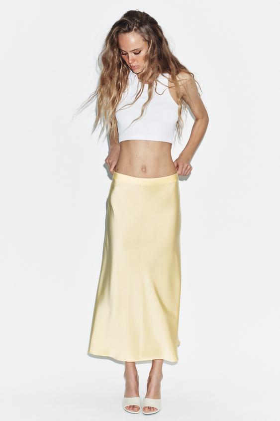 ZARA АТЛАСНАЯ ЮБКА МИДИ, ПАСТЕЛЬНО-ЖЕЛТЫЙ
