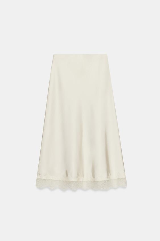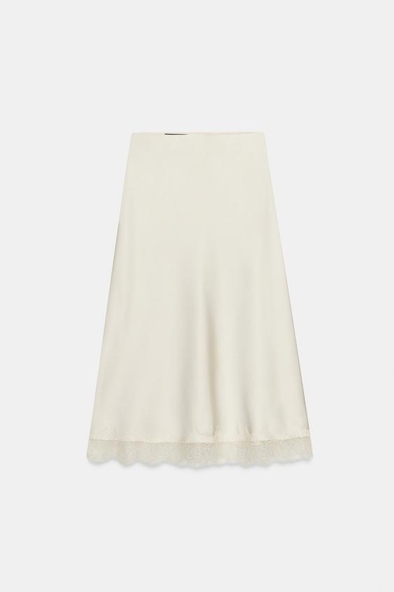 ZARA АТЛАСНАЯ ЮБКА МИДИ С КРУЖЕВОМ, СЛОНОВАЯ КОСТЬ
