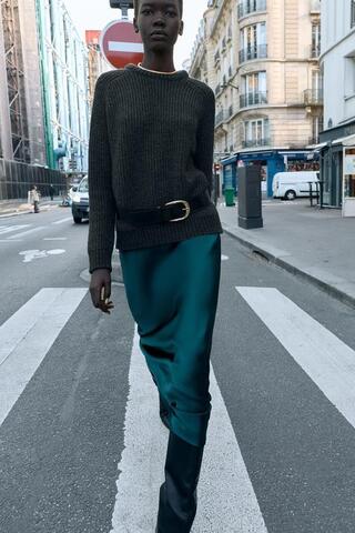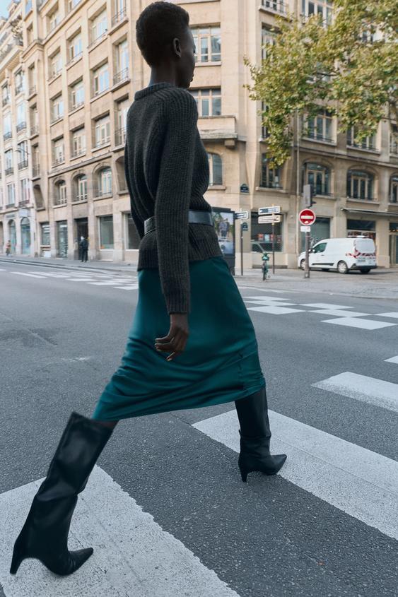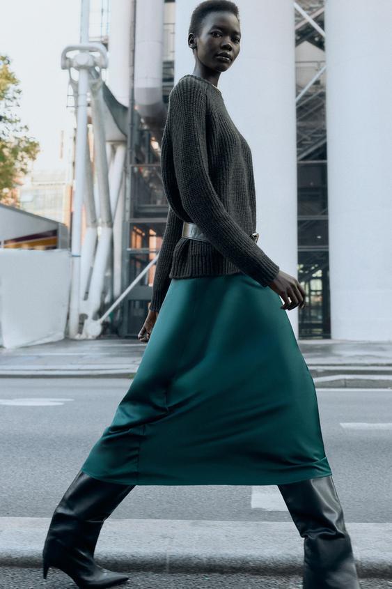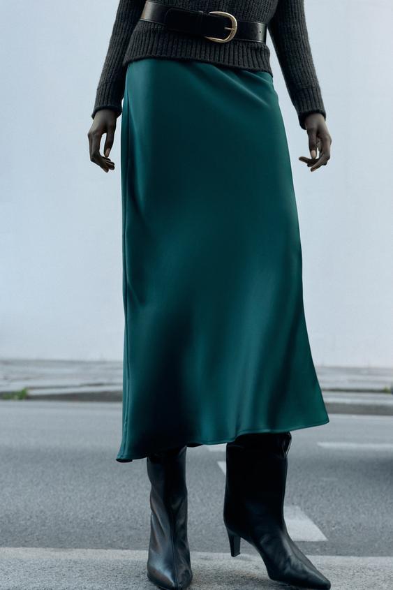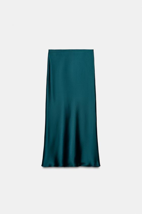 ZARA АТЛАСНАЯ ЮБКА МИДИ, УТИНО-ЗЕЛЕНЫЙ