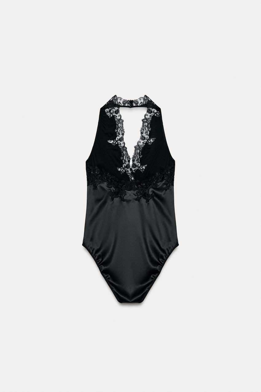 ZARA АТЛАСНОЕ БОДИ С ГОРЛОВИНОЙ ХАЛТЕР И КРУЖЕВОМ — ZW COLLECTION, ЧЕРНЫЙ