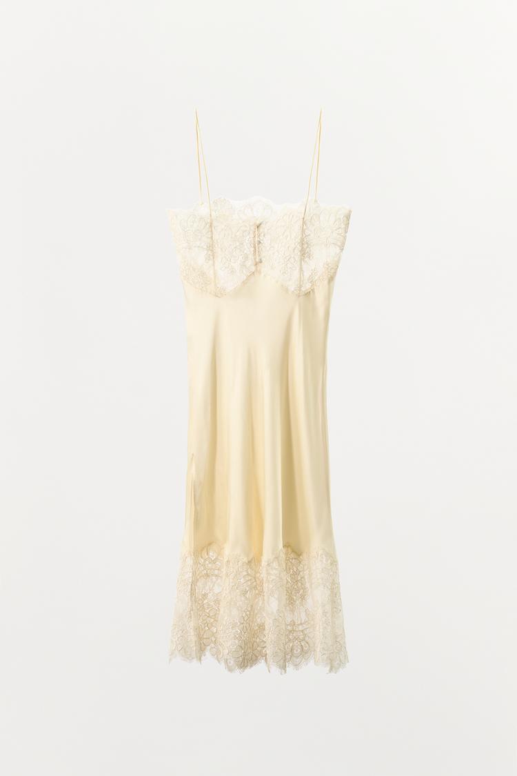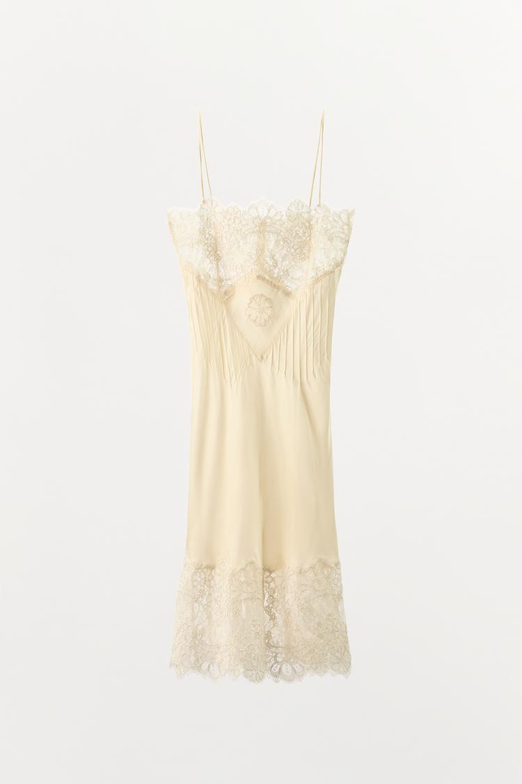 ZARA АТЛАСНОЕ ПЛАТЬЕ-КОМБИНАЦИЯ С КРУЖЕВОМ, ЭКРЮ