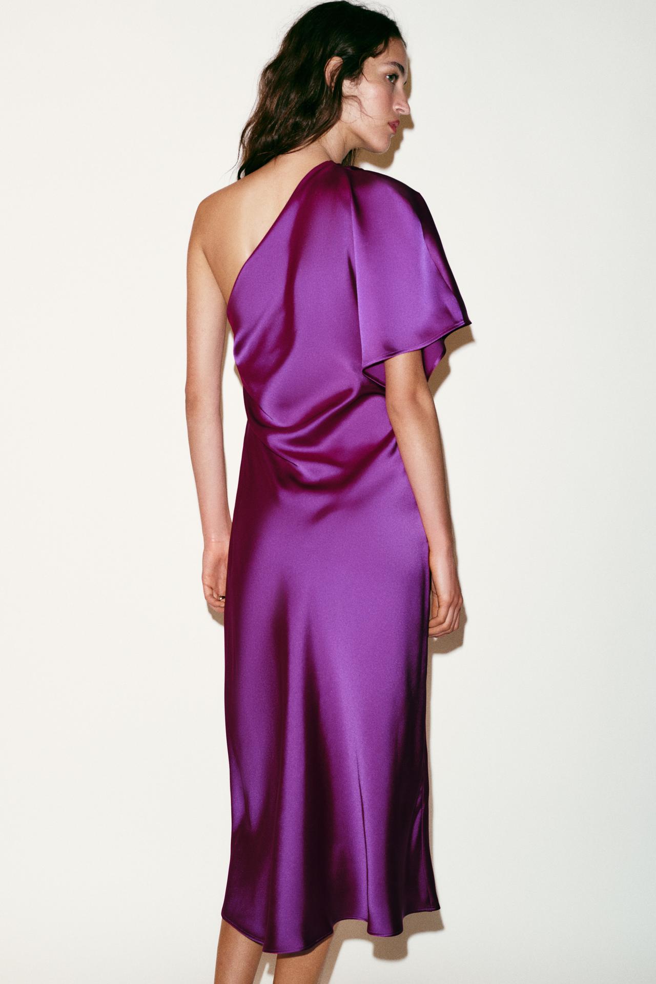 ZARA АТЛАСНОЕ ПЛАТЬЕ МИДИ АСИММЕТРИЧНОГО КРОЯ, ЛИЛОВЫЙ