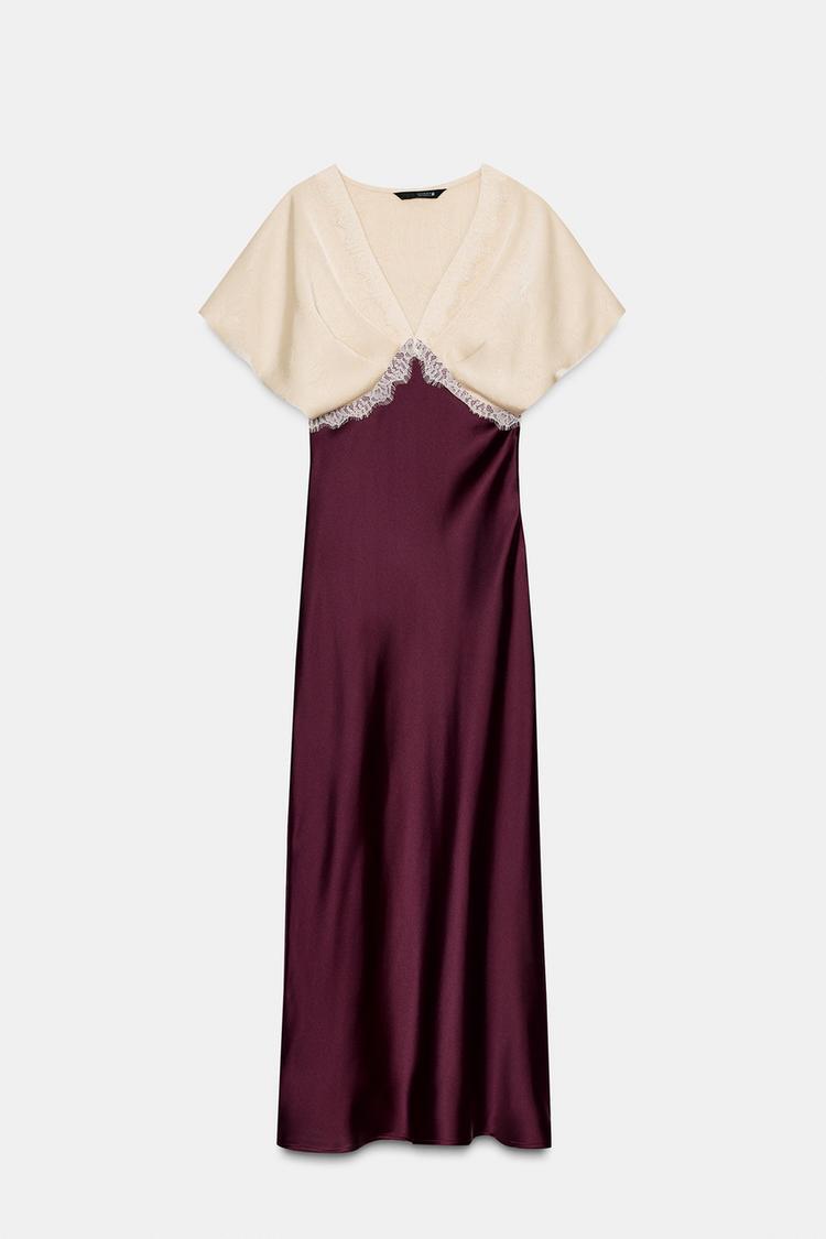 ZARA АТЛАСНОЕ ПЛАТЬЕ МИДИ С КОМБИНИРОВАННЫМ КРУЖЕВОМ, БУРГУНДИ