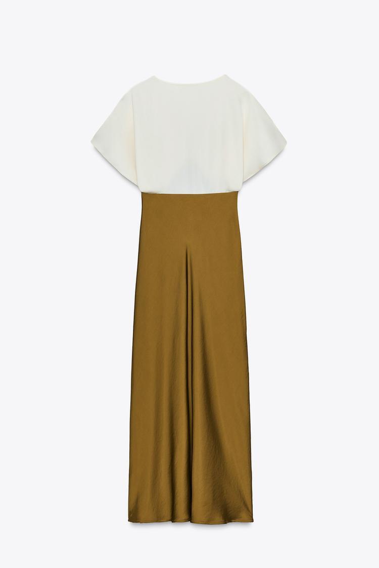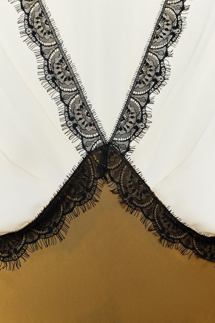 ZARA АТЛАСНОЕ ПЛАТЬЕ МИДИ С КРУЖЕВОМ И КОНТРАСТНОЙ ОТДЕЛКОЙ, ЭКРЮ/ХАКИ