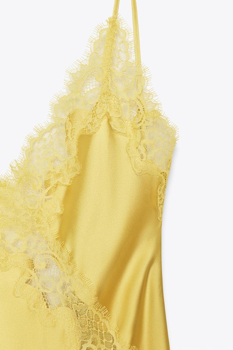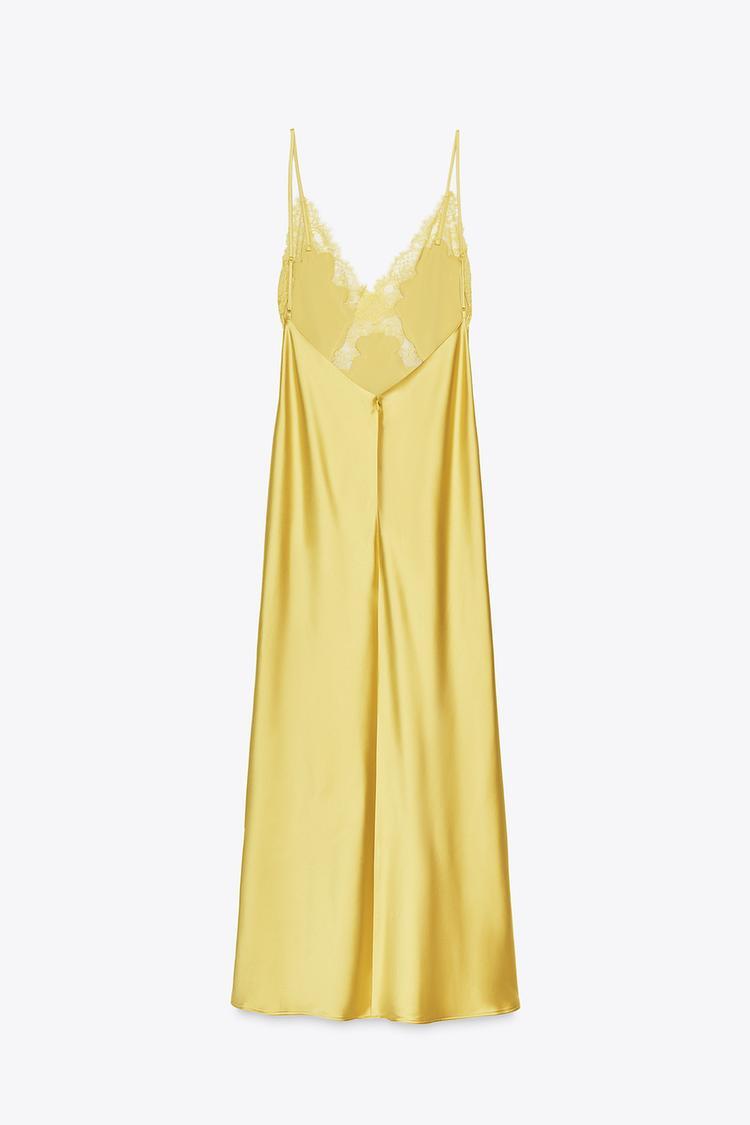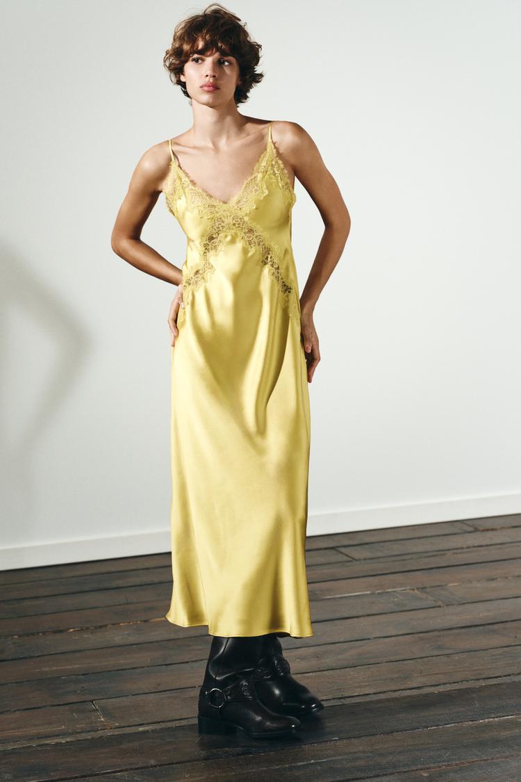 ZARA АТЛАСНОЕ ПЛАТЬЕ МИДИ С КРУЖЕВОМ, ЖЕЛТЫЙ