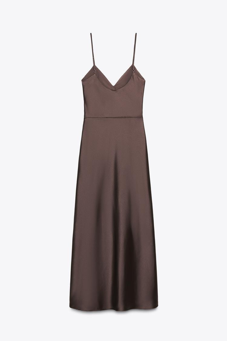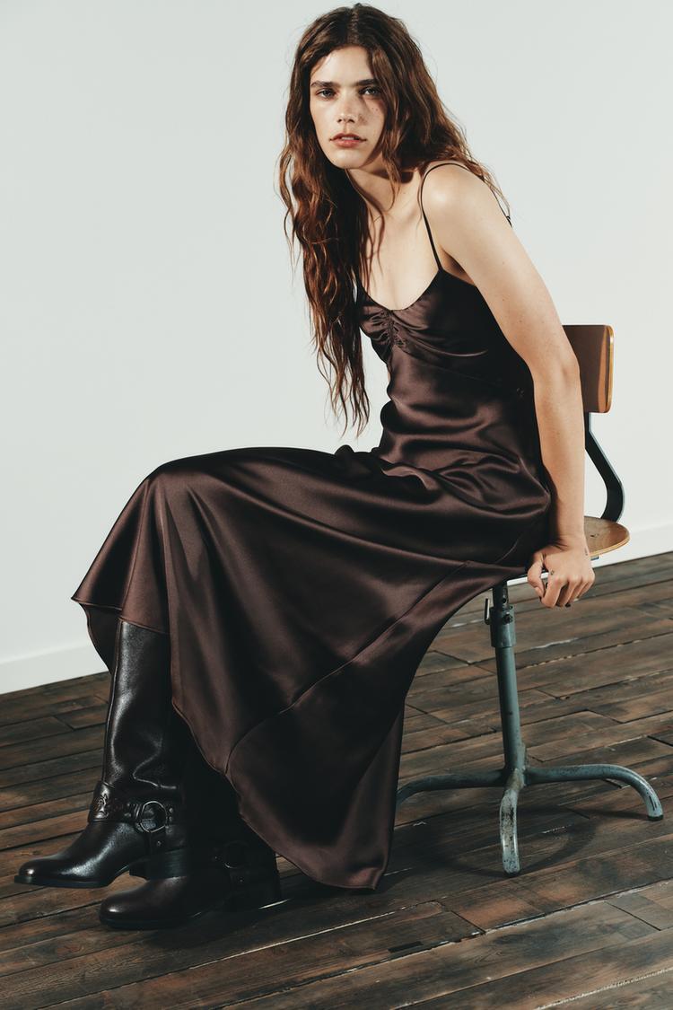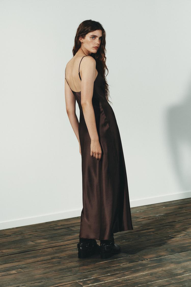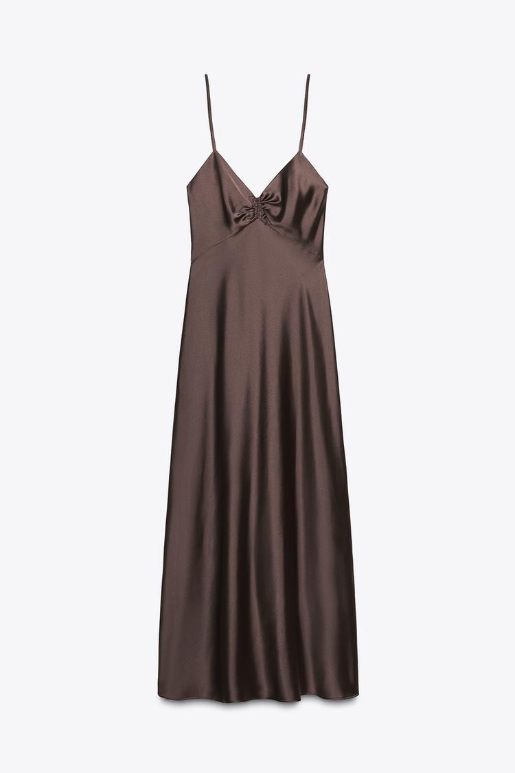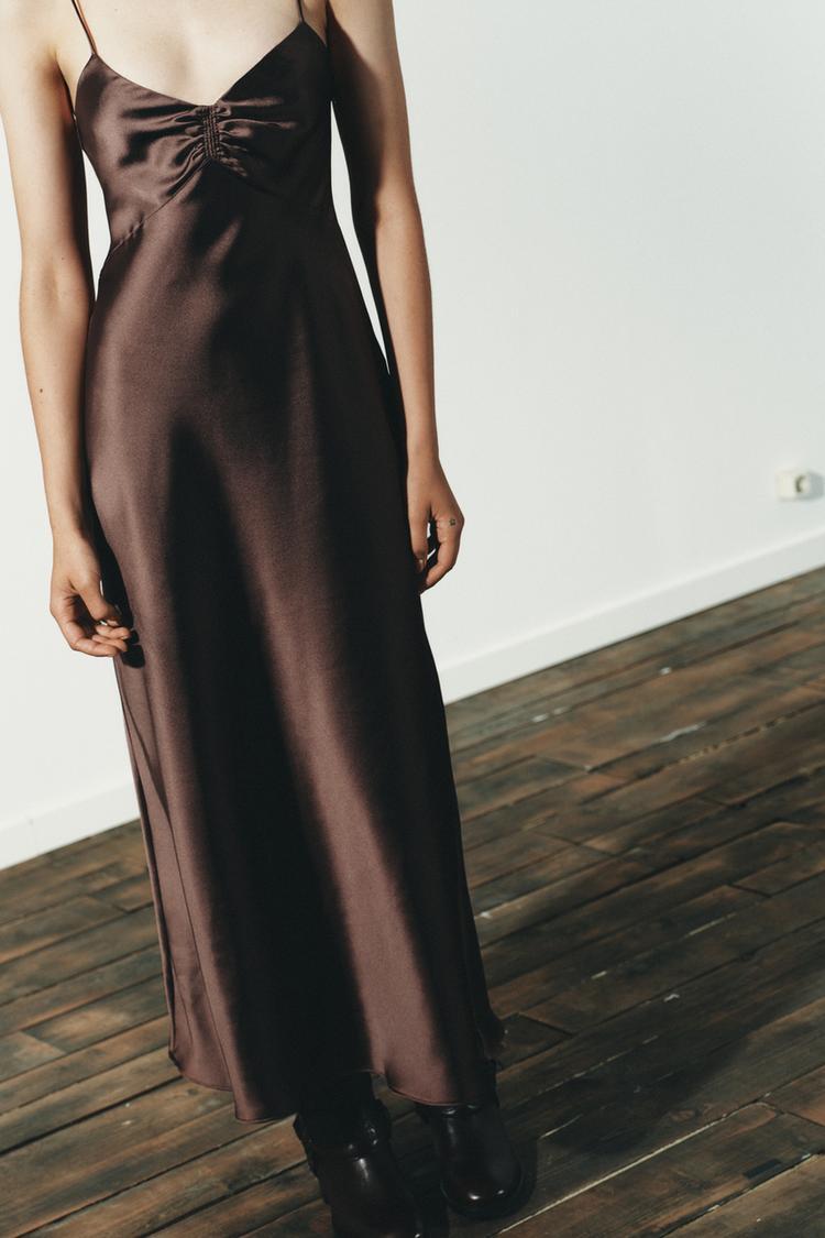 ZARA АТЛАСНОЕ ПЛАТЬЕ МИДИ СО СБОРКАМИ, ТЕМНО-КОРИЧНЕВЫЙ
