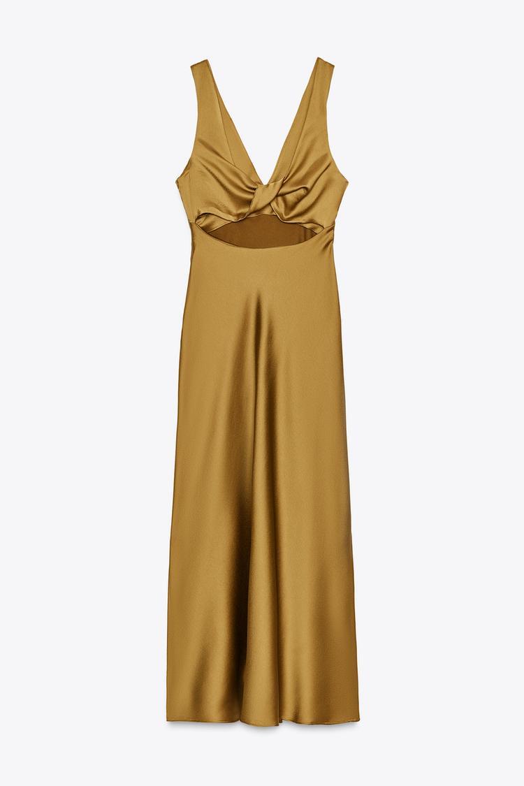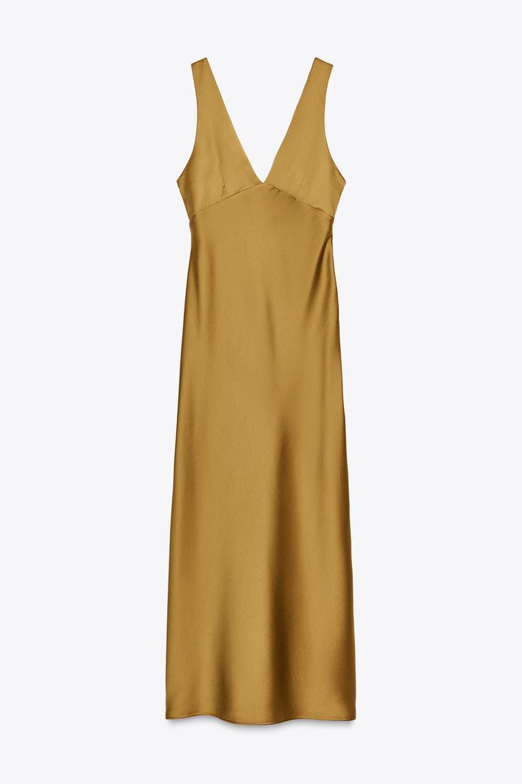 ZARA АТЛАСНОЕ ПЛАТЬЕ МИДИ, ЦВЕТ ОЛИВКОВОГО МАСЛА