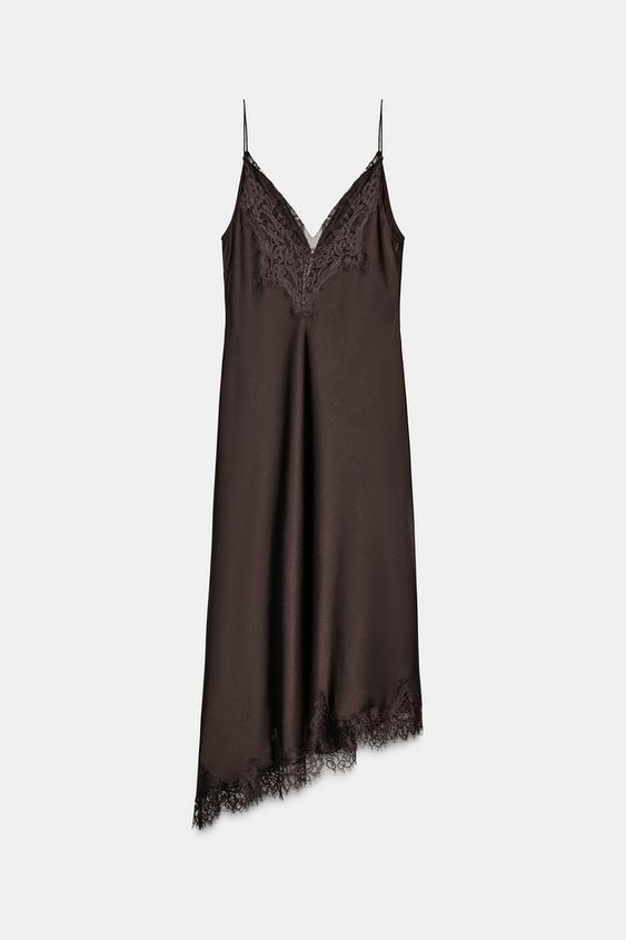 ZARA АТЛАСНОЕ ПЛАТЬЕ С КРУЖЕВОМ — ZW COLLECTION, КОРИЧНЕВЫЙ