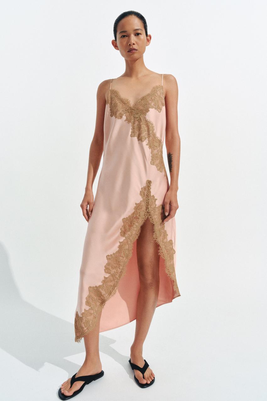 ZARA АТЛАСНОЕ ПЛАТЬЕ С КРУЖЕВОМ — ZW COLLECTION, ПУДРОВО-РОЗОВЫЙ