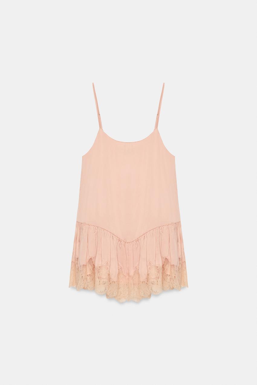 ZARA АТЛАСНОЕ ПЛАТЬЕ В БЕЛЬЕВОМ СТИЛЕ С КРУЖЕВОМ, ПАСТЕЛЬНО-РОЗОВЫЙ