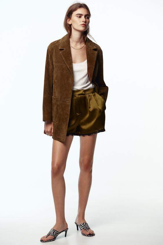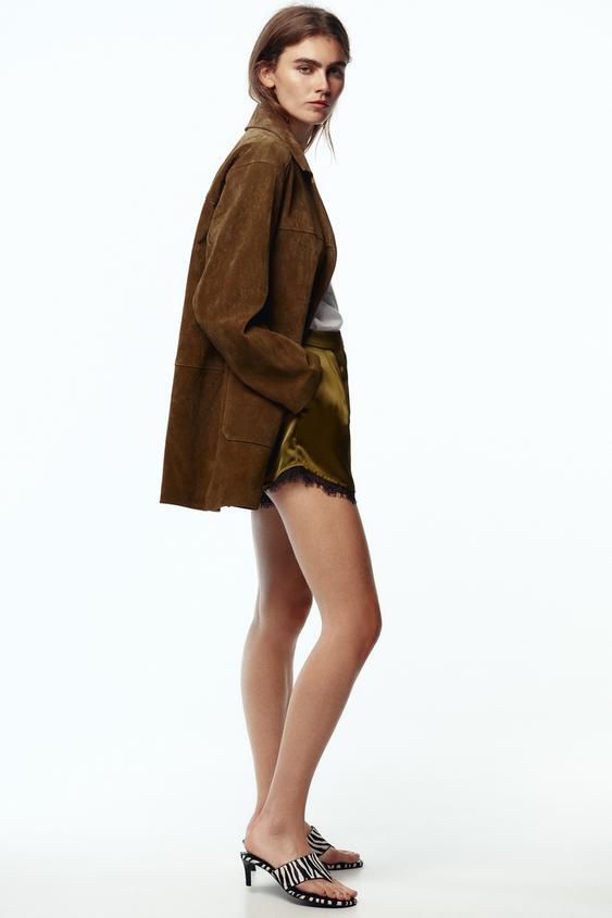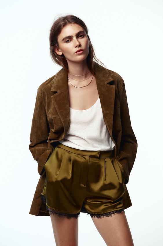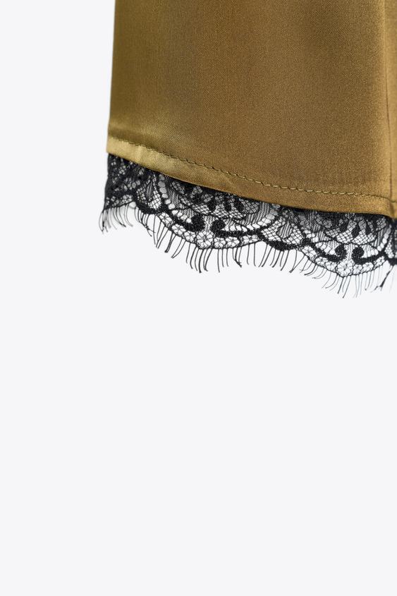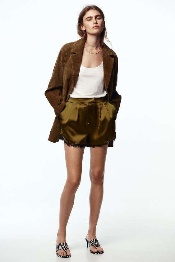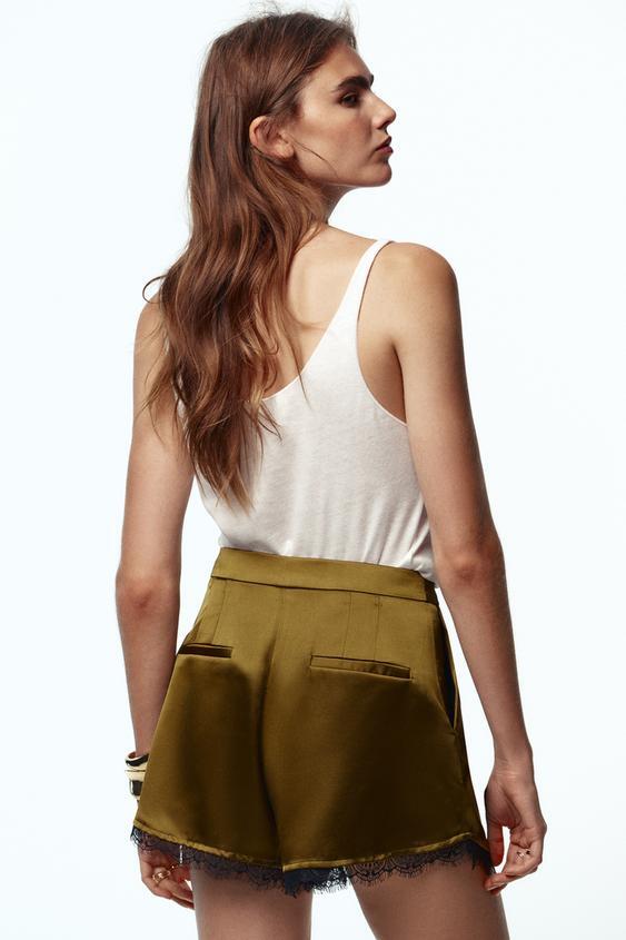 ZARА АТЛАСНЫЕ БЕРМУДЫ С КРУЖЕВОМ, ЦВЕТ ОЛИВКОВОГО МАСЛА