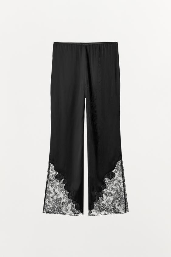 ZARA АТЛАСНЫЕ БРЮКИ С КРУЖЕВНОЙ ОТДЕЛКОЙ, ЧЕРНЫЙ