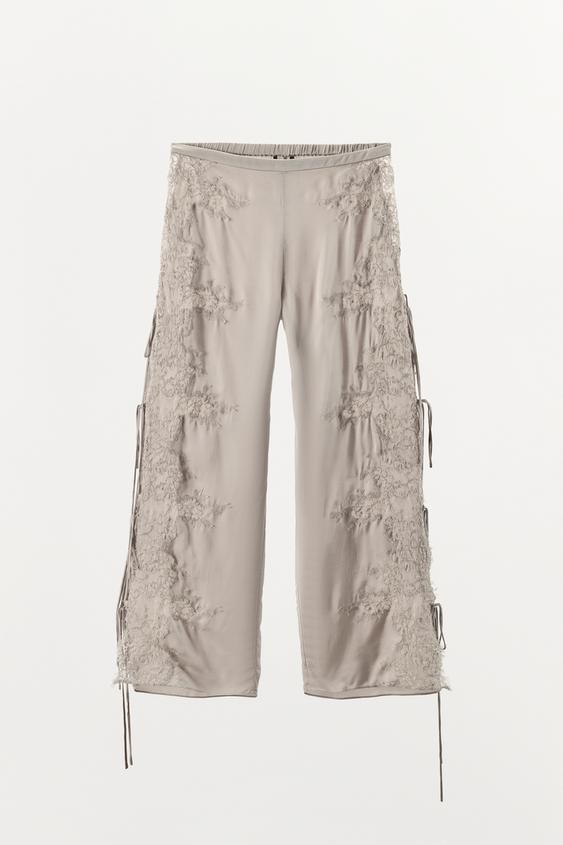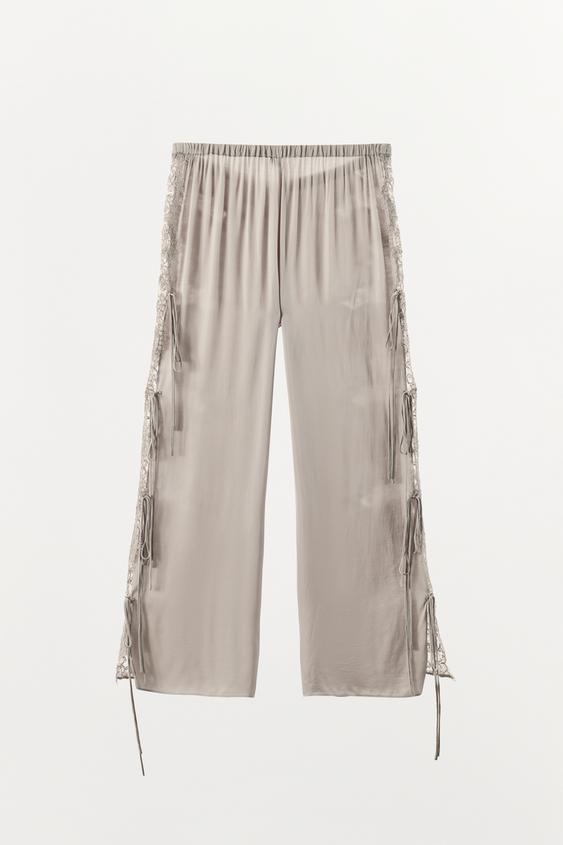 ZARA АТЛАСНЫЕ БРЮКИ С КРУЖЕВОМ И РАЗРЕЗАМИ, СЕРЫЙ