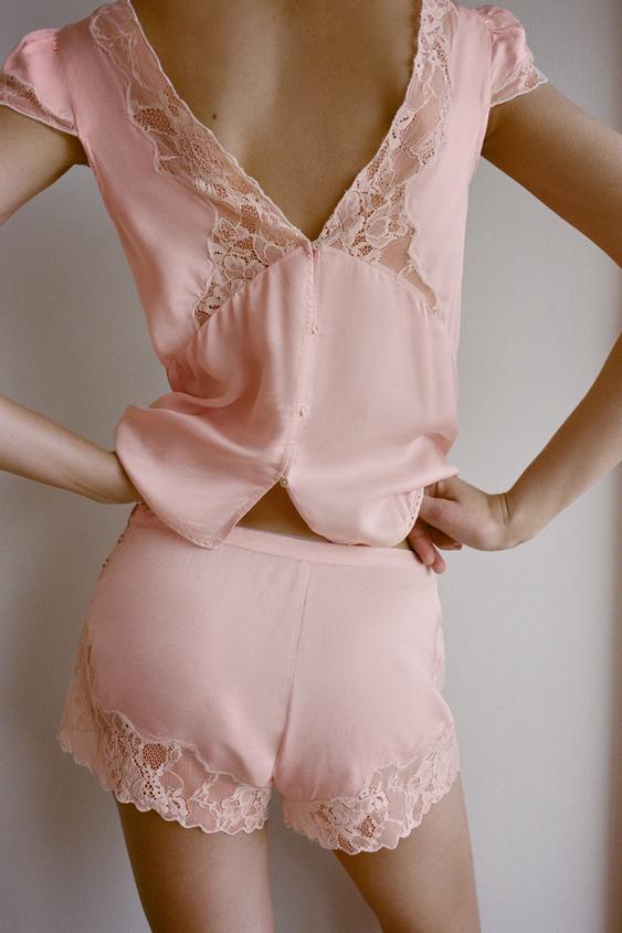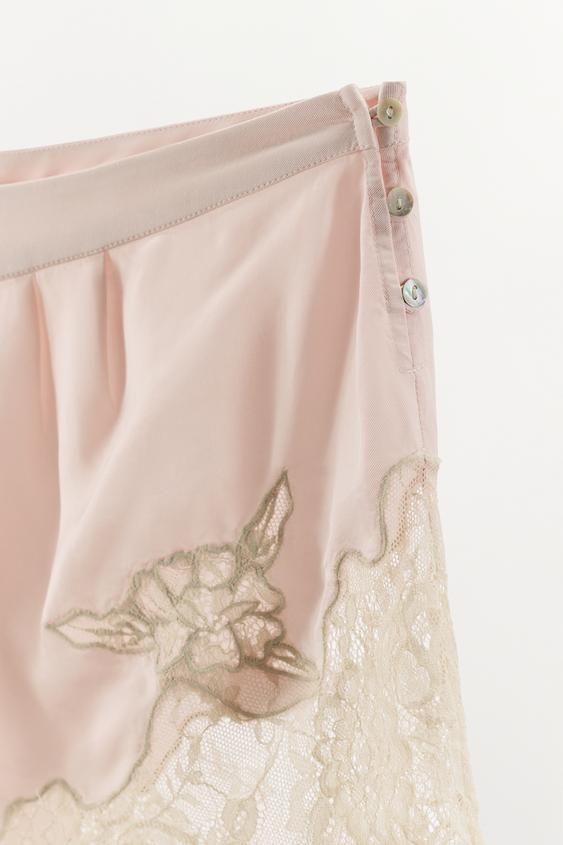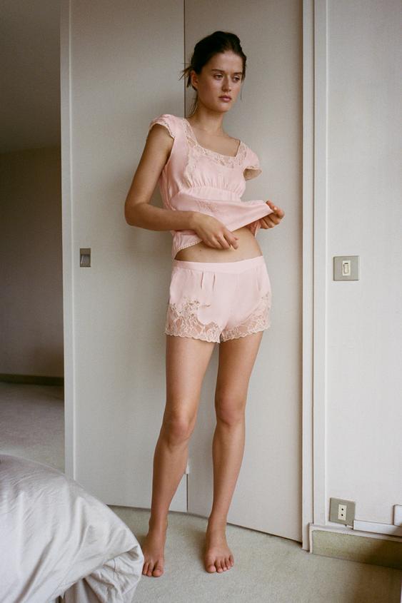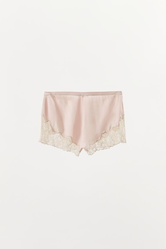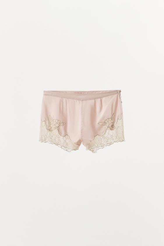 ZARA АТЛАСНЫЕ ШОРТЫ С КРУЖЕВНОЙ ВЫШИВКОЙ, ПАСТЕЛЬНО-РОЗОВЫЙ