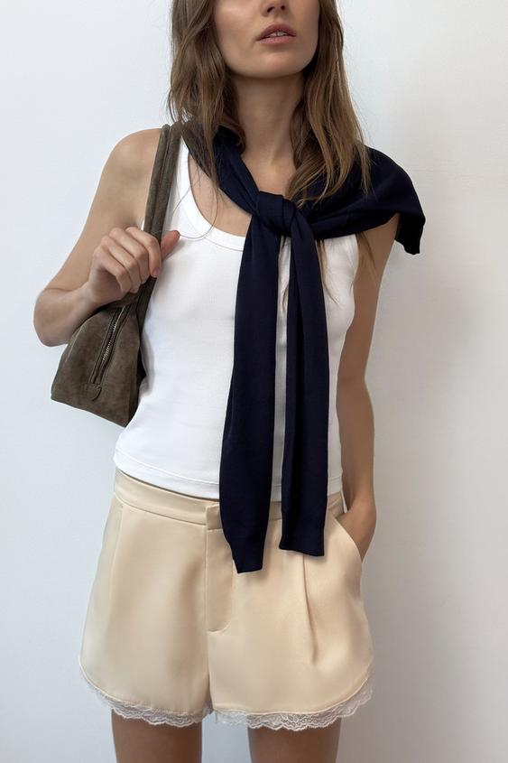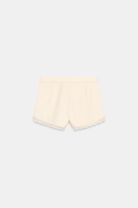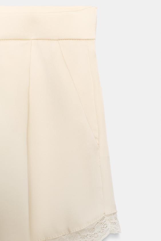 ZARA АТЛАСНЫЕ ШОРТЫ С КРУЖЕВОМ, ВАНИЛЬНЫЙ