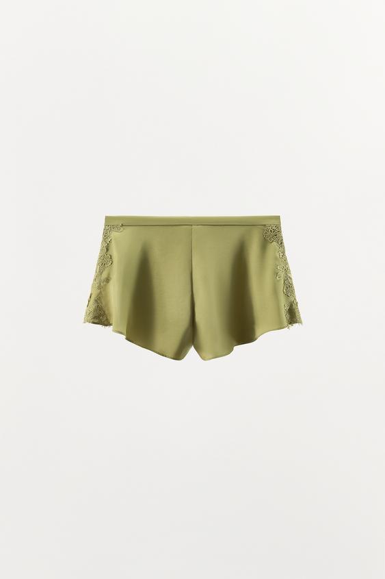 ZARA АТЛАСНЫЕ ШОРТЫ С КРУЖЕВОМ, ЗЕЛЕНЫЙ