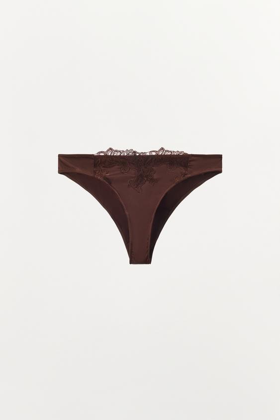 ZARA АТЛАСНЫЕ ТРУСЫ С КРУЖЕВОМ, КОРИЧНЕВЫЙ