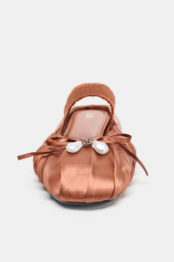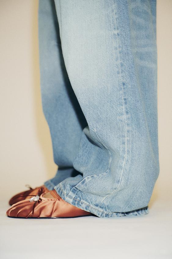 Туфли-мюли на плоской подошве из ткани с атласным эффектом. Сборки на носке и бант с жемчугом спереди. Эластичный ремешок на подъеме. Закругленный носок.