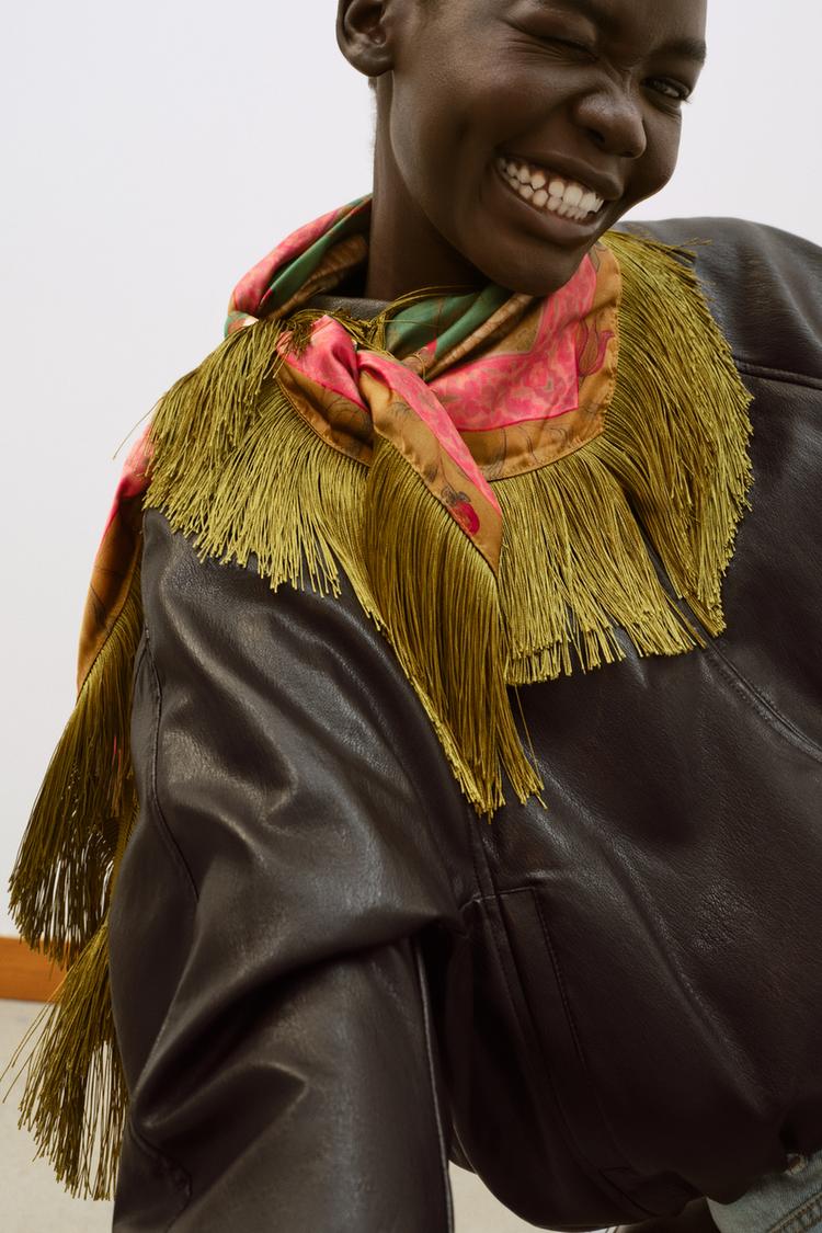 ZARA АТЛАСНЫЙ ПЛАТОК С БАХРОМОЙ, ОЛИВКОВЫЙ
