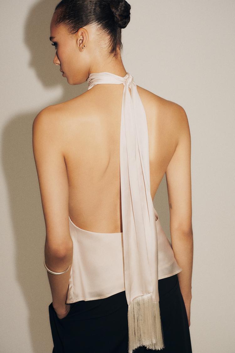 ZARA АТЛАСНЫЙ ТОП С ГОРЛОВИНОЙ ХАЛТЕР И БАХРОМОЙ, ПЕСОЧНЫЙ