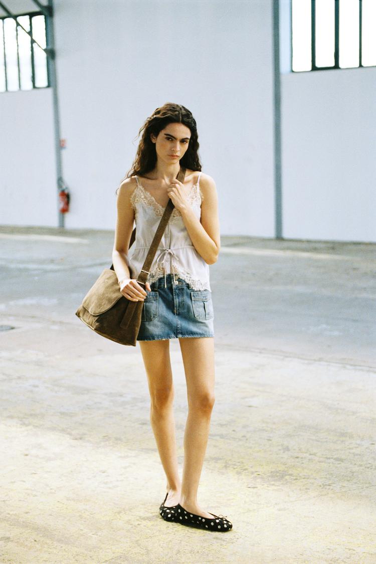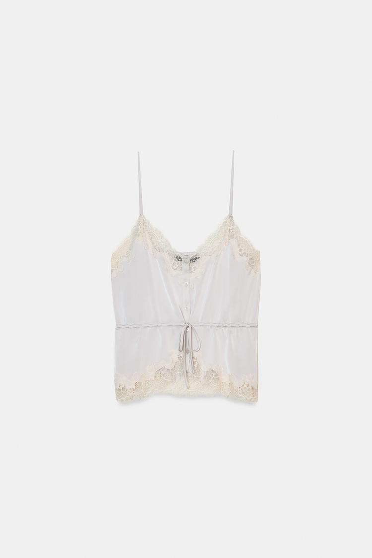 ZARA АТЛАСНЫЙ ТОП С КРУЖЕВОМ, ЖЕМЧУЖНО-СЕРЫЙ