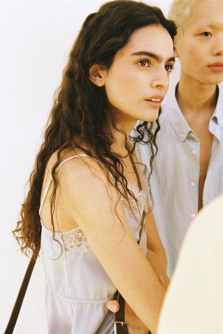 Топ из атласной ткани. V-образный вырез и тонкие бретели. Регулируемая талия на завязках. Отделка кружевом.