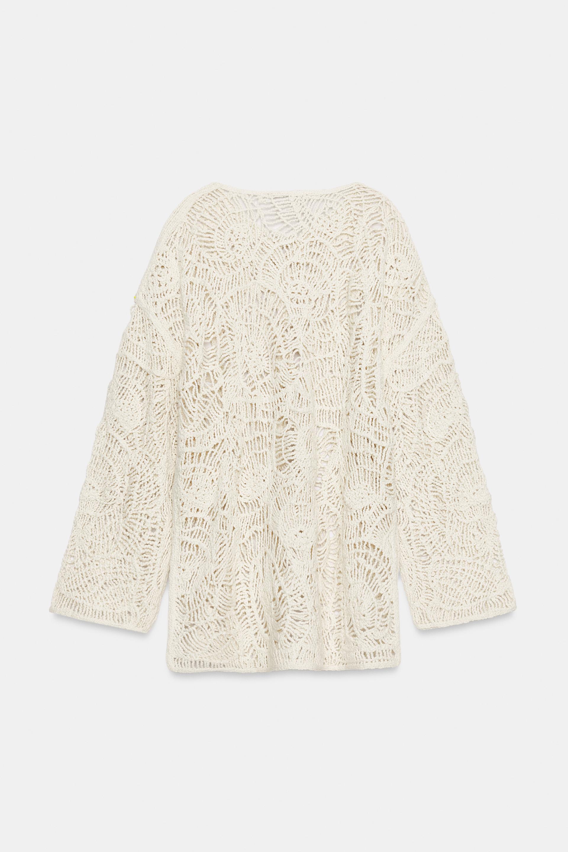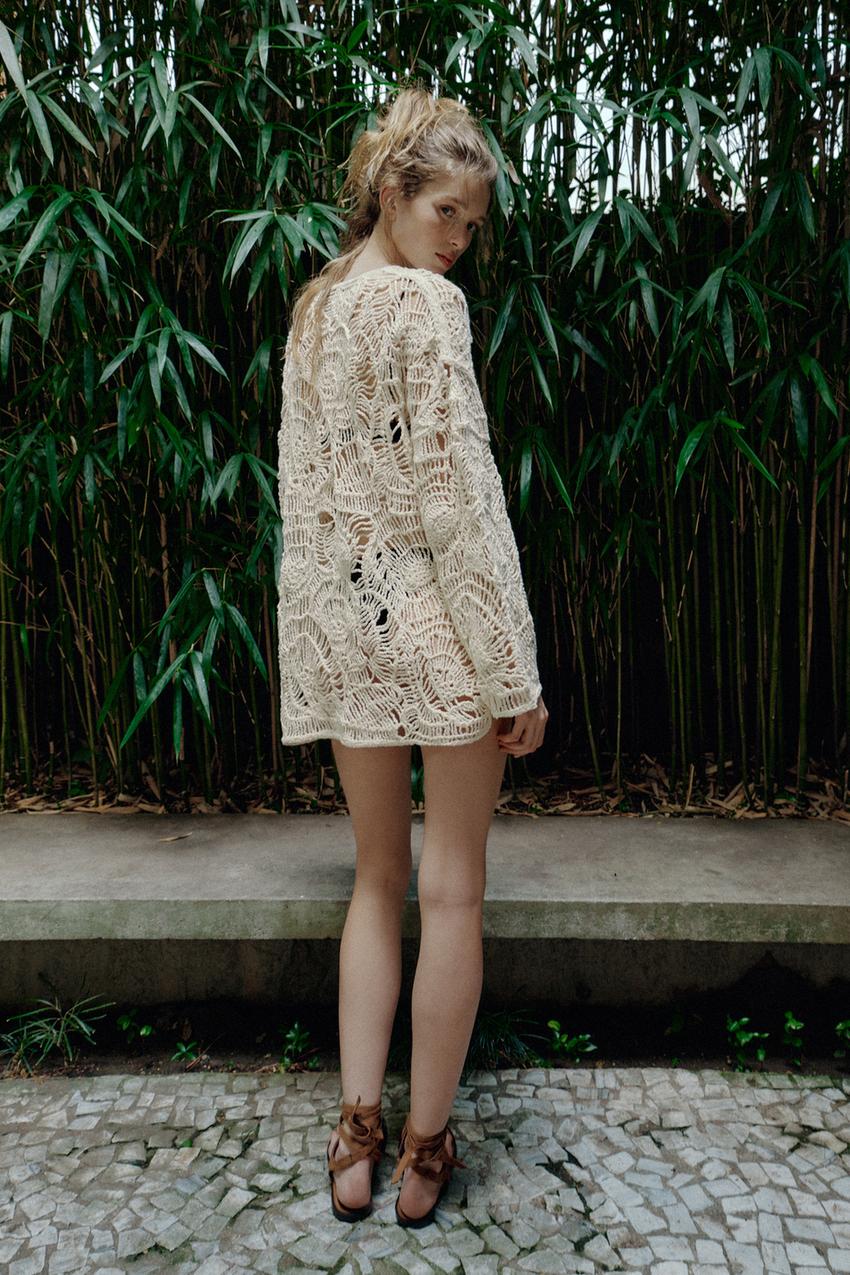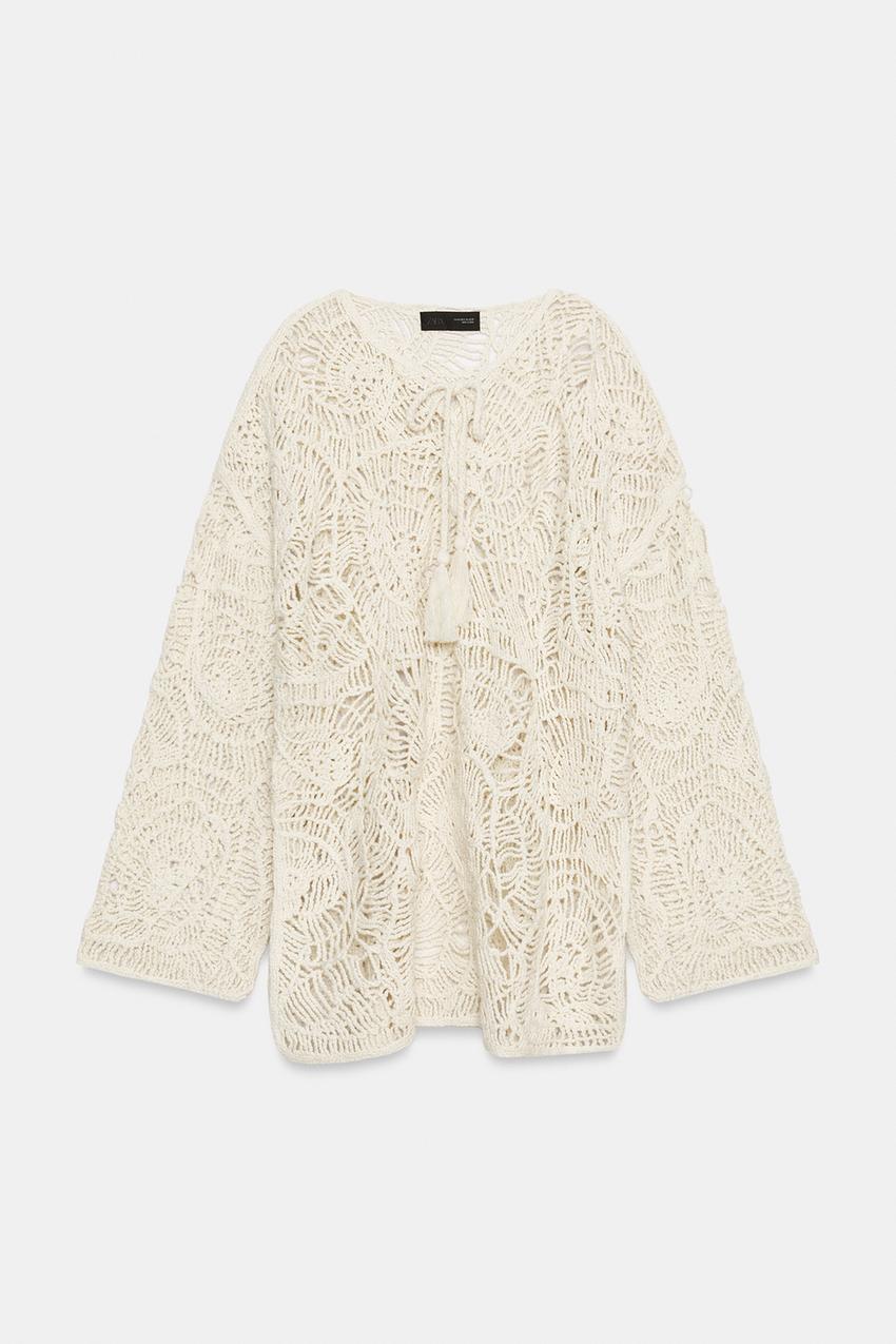 ZARA АЖУРНОЕ ТРИКОТАЖНОЕ ПЛАТЬЕ С КИСТОЧКАМИ, ЭКРЮ