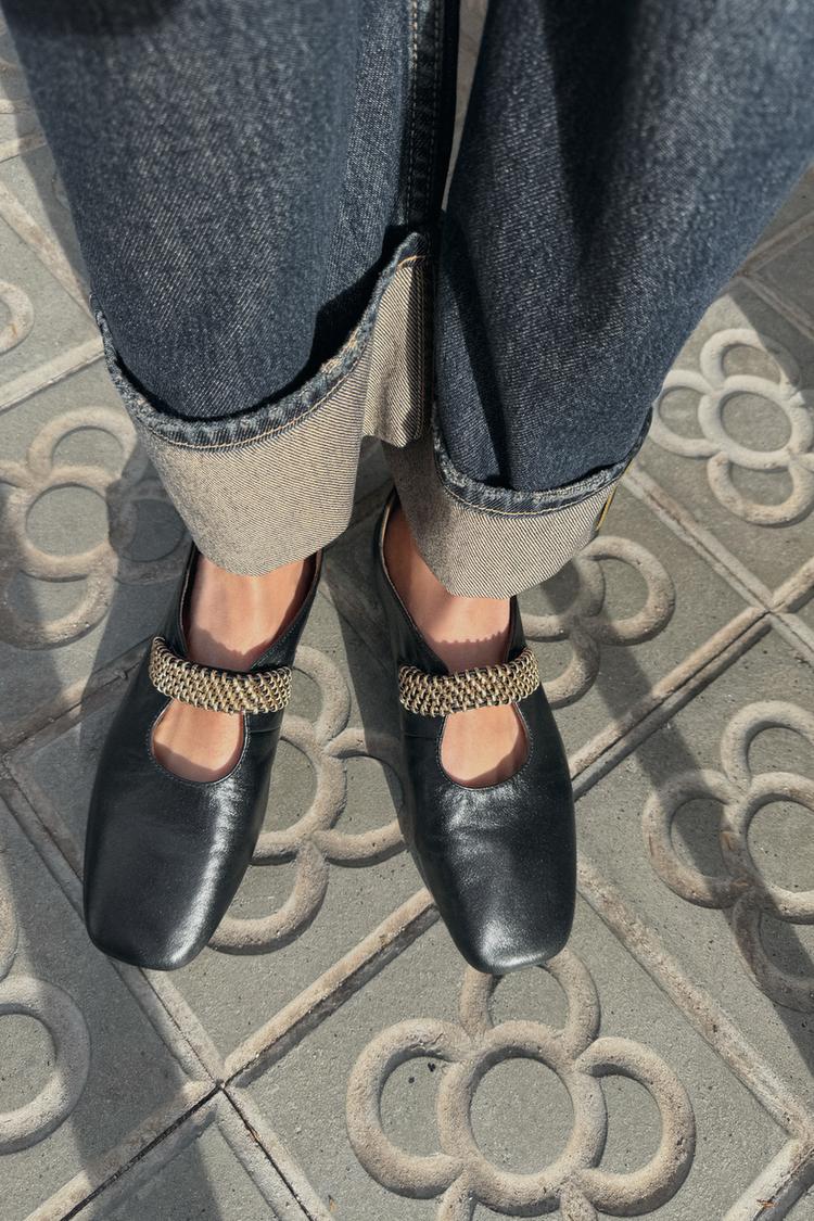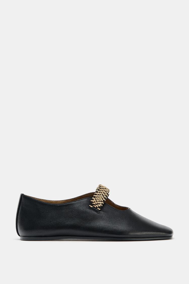 ZARA БАЛЕТКИ ИЗ КОЖИ С МЕТАЛЛИЧЕСКОЙ ПОЛОСКОЙ, ЧЕРНЫЙ