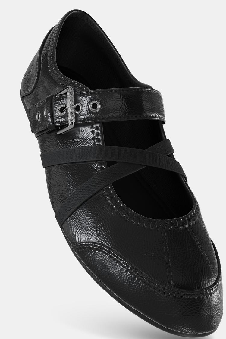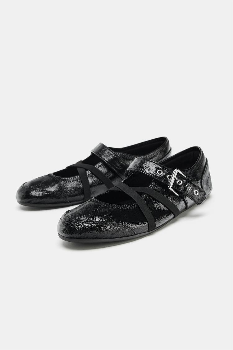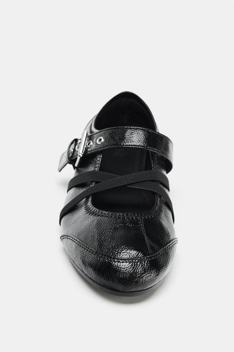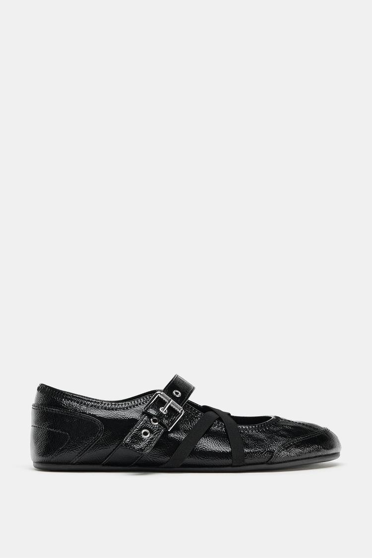 ZARA БАЛЕТКИ ИЗ ЛАКИРОВАННОЙ ИСКУССТВЕННОЙ КОЖИ С ПРЯЖКАМИ, ЧЕРНЫЙ