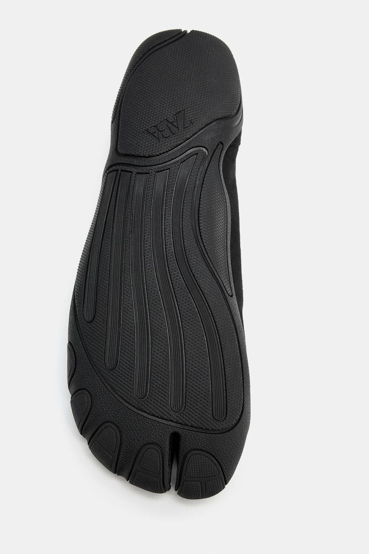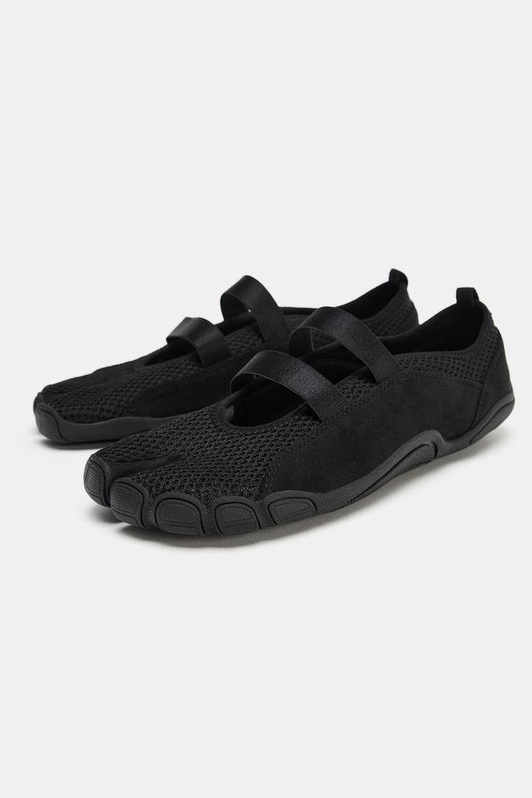 Балетки с отделением для пальцев. Двойной эластичный ремешок спереди. Задняя петля. Контрастная подошва.