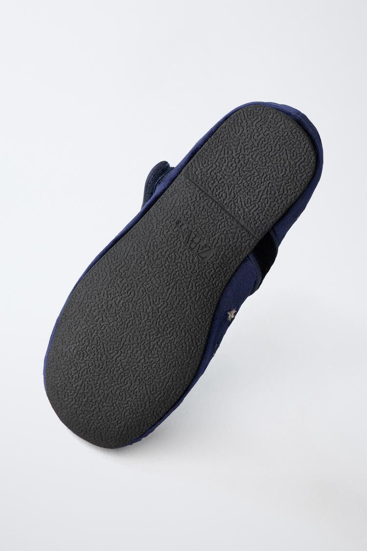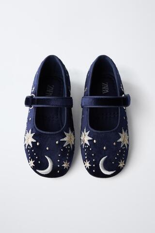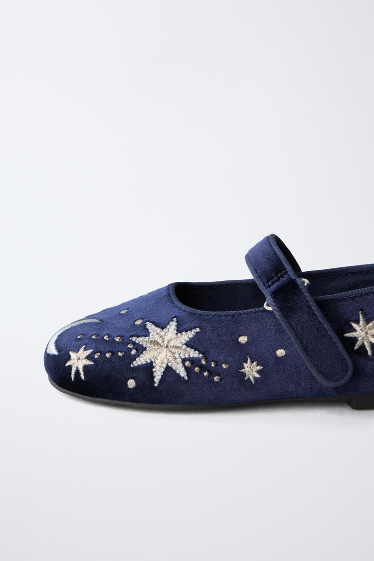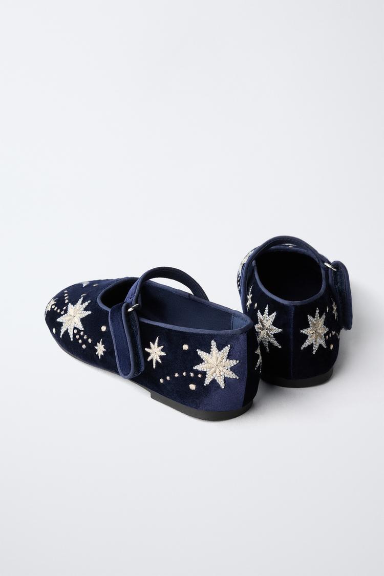 ZARA БАРХАТНЫЕ БАЛЕТКИ С ВЫШИВКОЙ, СИНИЙ