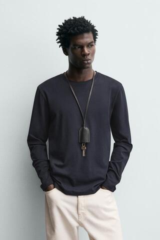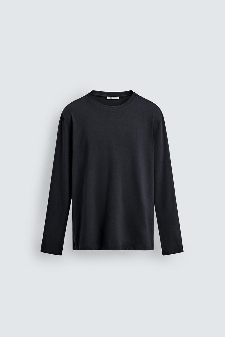 Футболка прилегающего кроя из эластичного хлопка. Круглый вырез и длинные рукава.