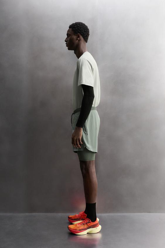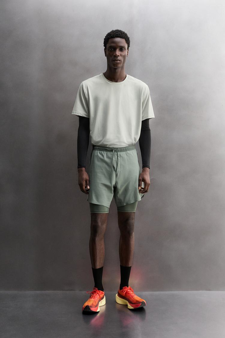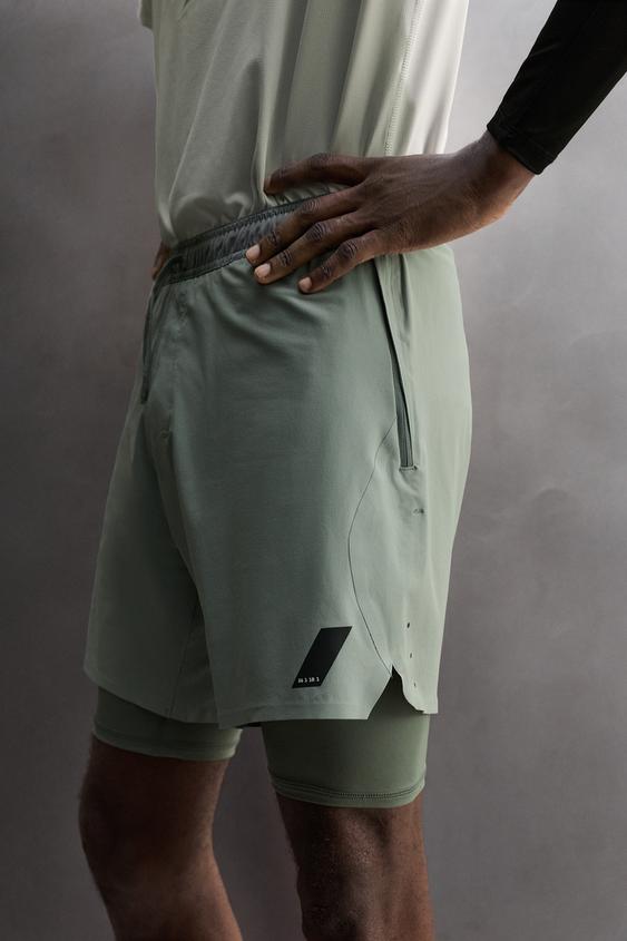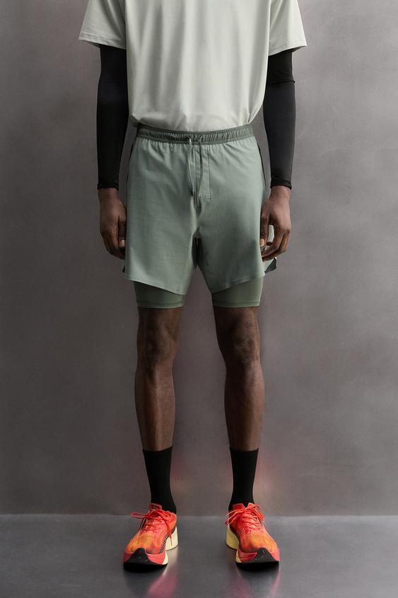 ZARA БАЗОВЫЕ СПОРТИВНЫЕ ШОРТЫ 2 В 1, ЛИНЯЛЫЙ ЗЕЛЕНЫЙ