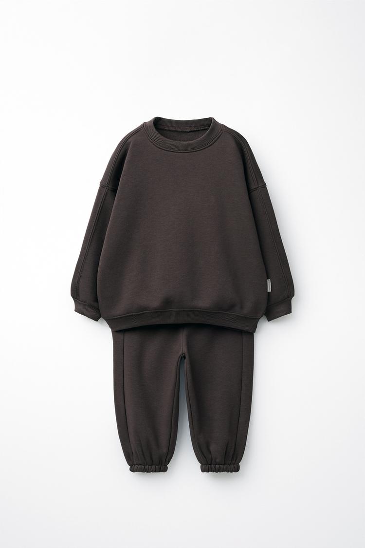 Комплект из двух предметов. Толстовка с круглым вырезом и длинными рукавами. Детали в рубчик. Брюки-джоггеры с эластичным поясом. Декоративная нашивка. Внутренняя сторона из теплого и мягкого начесного материала. Ткань на 72% состоит из хлопка.