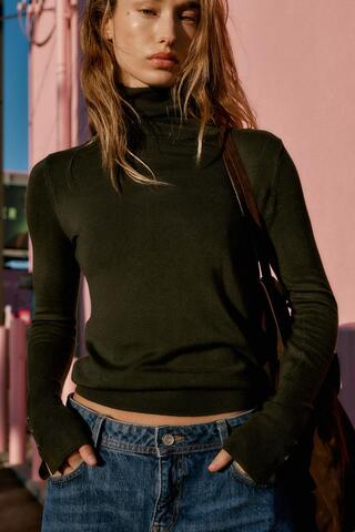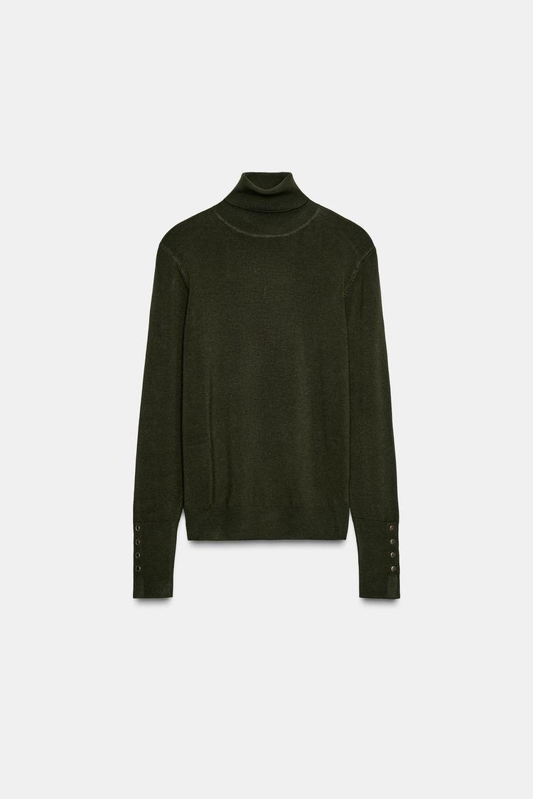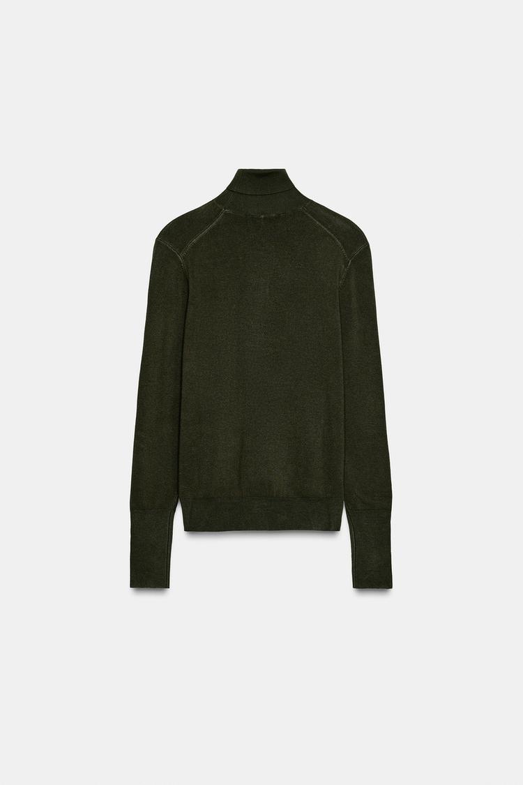 ZARA БАЗОВЫЙ ТРИКОТАЖНЫЙ ДЖЕМПЕР С ВЫСОКИМ ВОРОТНИКОМ, ТЕМНЫЙ ХАКИ