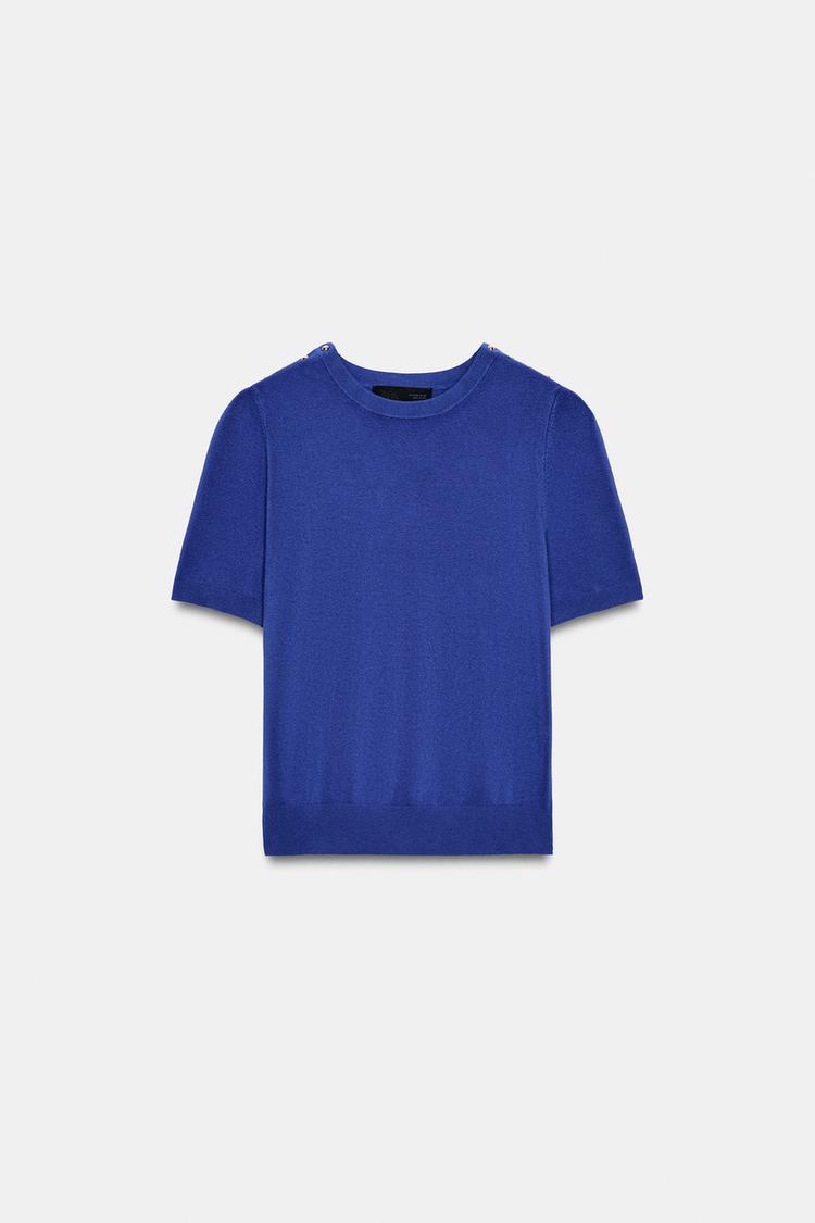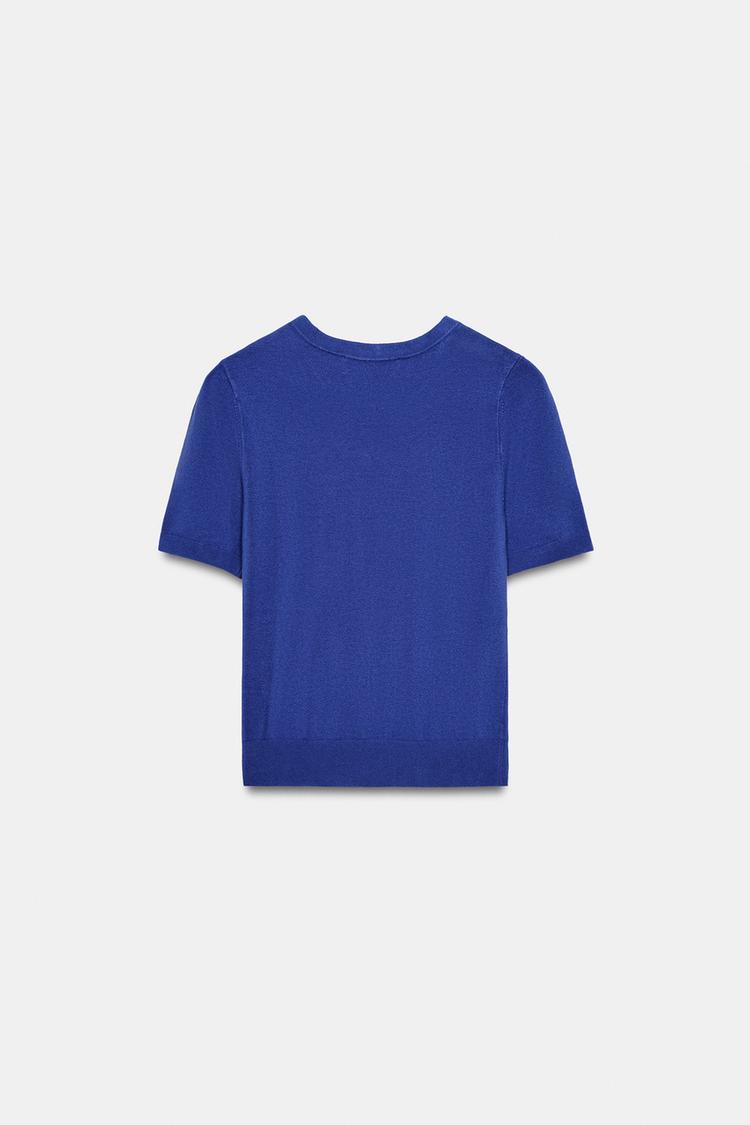 ZARA БАЗОВЫЙ ТРИКОТАЖНЫЙ СВИТЕР С КОРОТКИМИ РУКАВАМИ, СИНИЙ