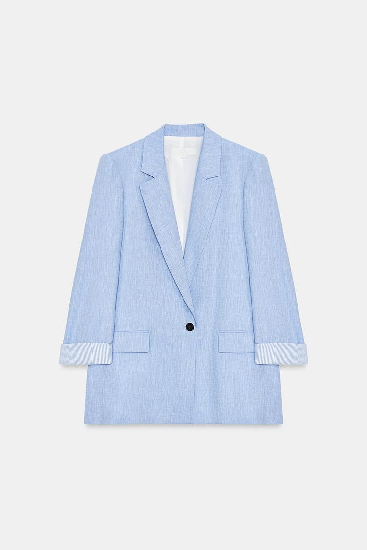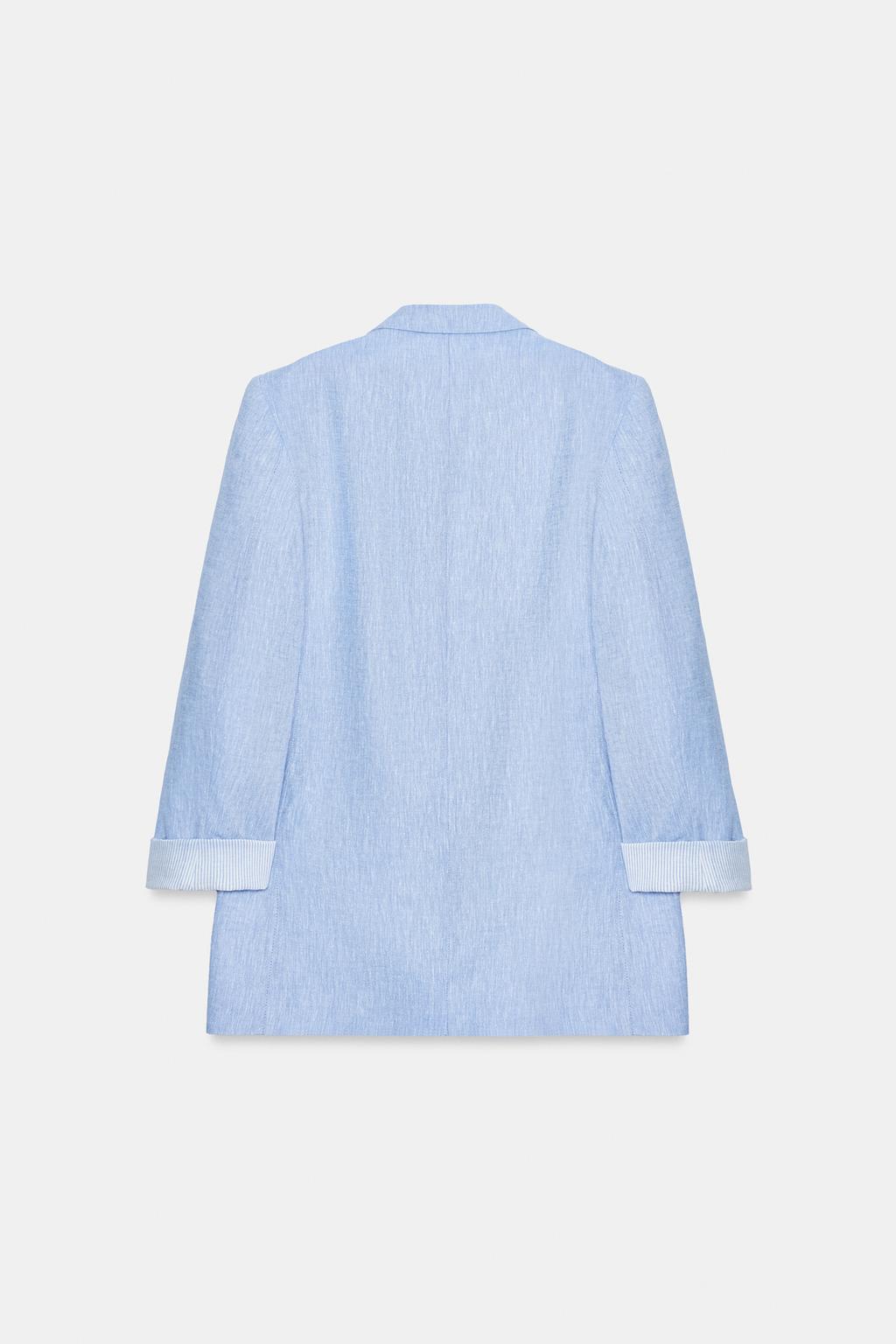 ZARA БЛЕЙЗЕР ИЗ СМЕСОВОГО ЛЬНА С ПОДВЕРНУТЫМИ РУКАВАМИ, ГОЛУБОЙ