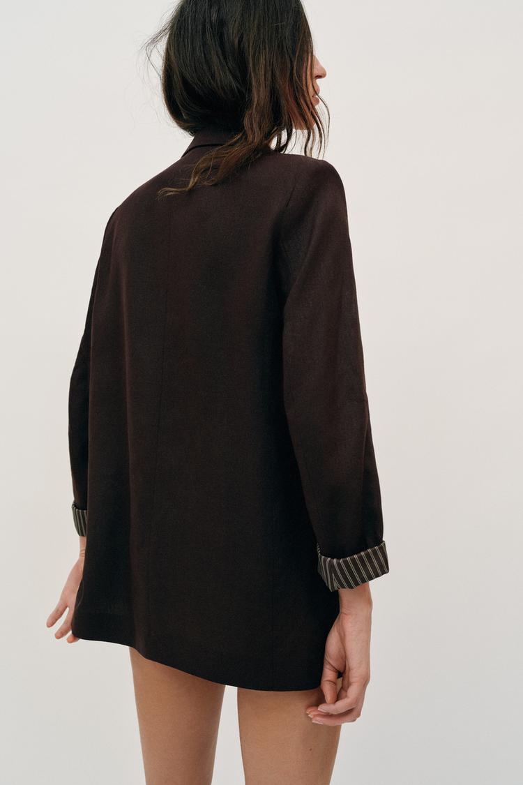 ZARA БЛЕЙЗЕР ИЗ СМЕСОВОГО ЛЬНА С ПОДВЕРНУТЫМИ РУКАВАМИ, ТЕМНО-КОРИЧНЕВЫЙ