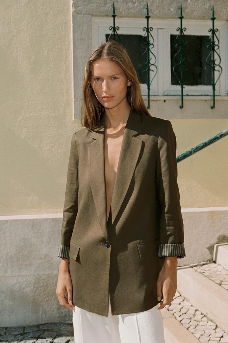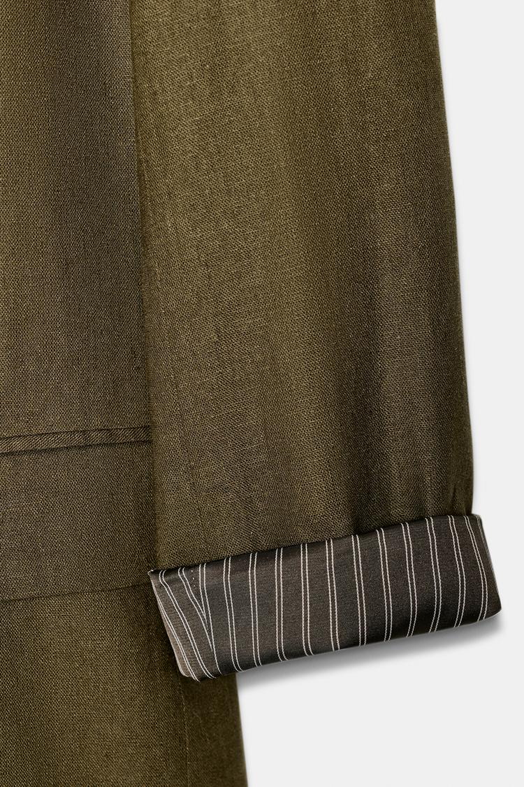 ZARA БЛЕЙЗЕР ИЗ СМЕСОВОГО ЛЬНА С ПОДВЕРНУТЫМИ РУКАВАМИ, ТЕМНЫЙ ХАКИ