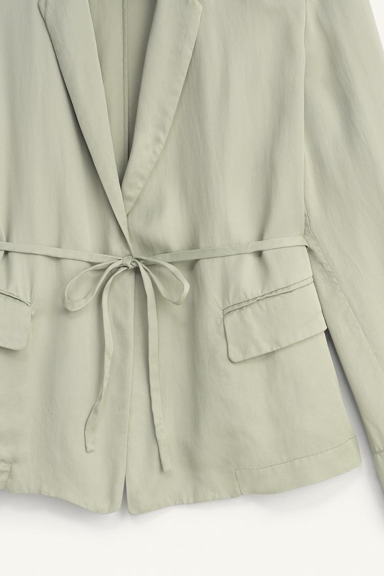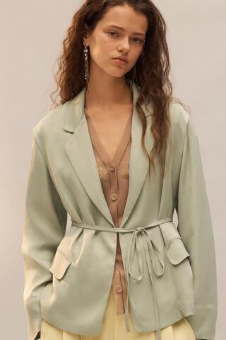 Блейзер из вискозной смесовой ткани. С отложным воротником и длинными рукавами. С карманами на клапанах спереди. С регулируемым поясом из той же ткани, что и сам пиджак, с завязками. С застежкой спереди.