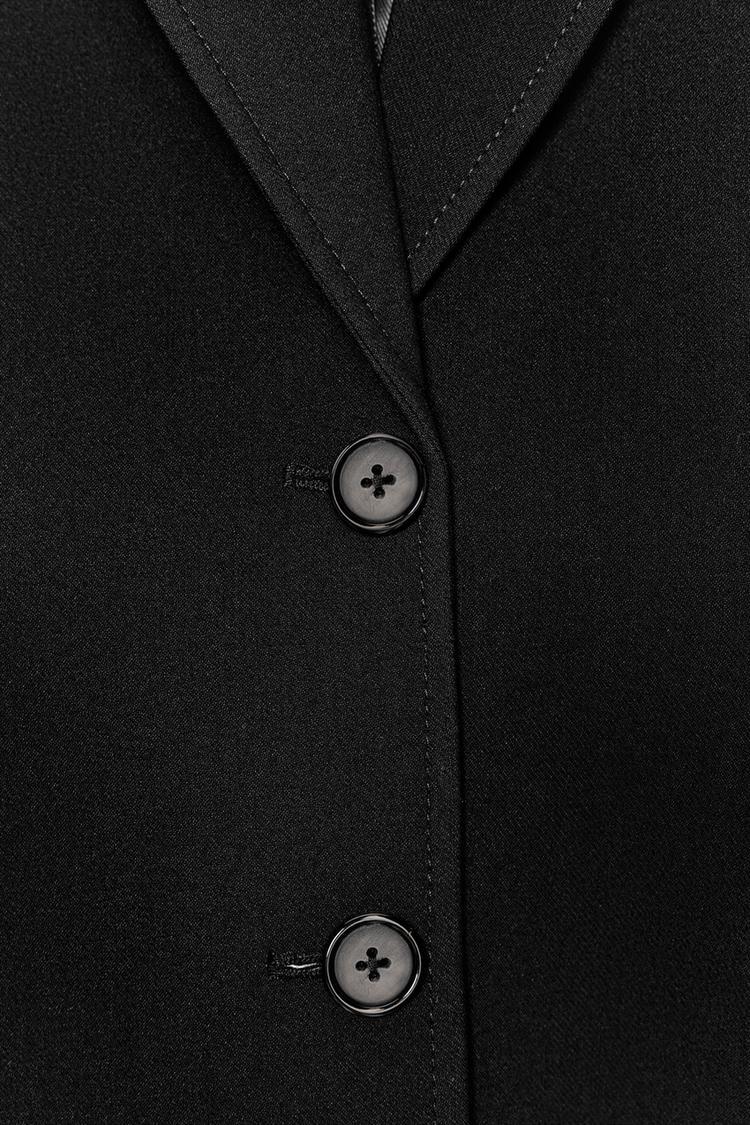 Блейзер облегающего кроя с длинными рукавами с разрезами и пуговицами, воротником с разрезными лацканами. Передние прорезные карманы. Декоративная строчка в тон, подкладка. Застегивается на пуговицы.