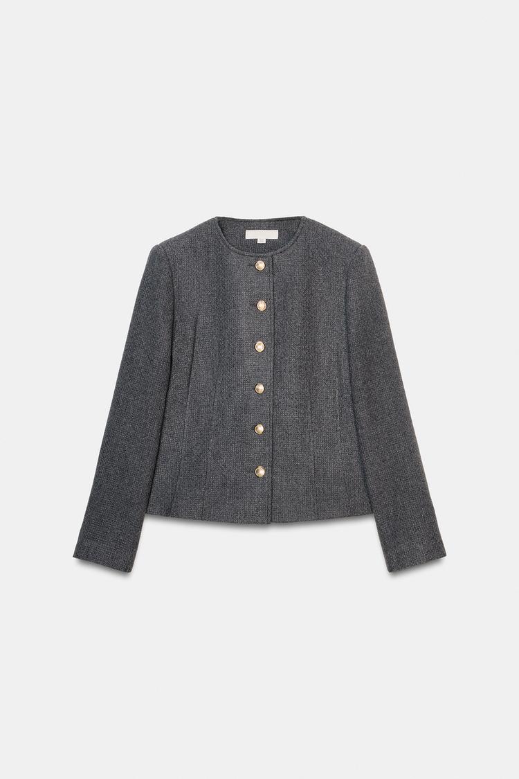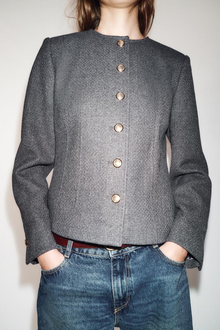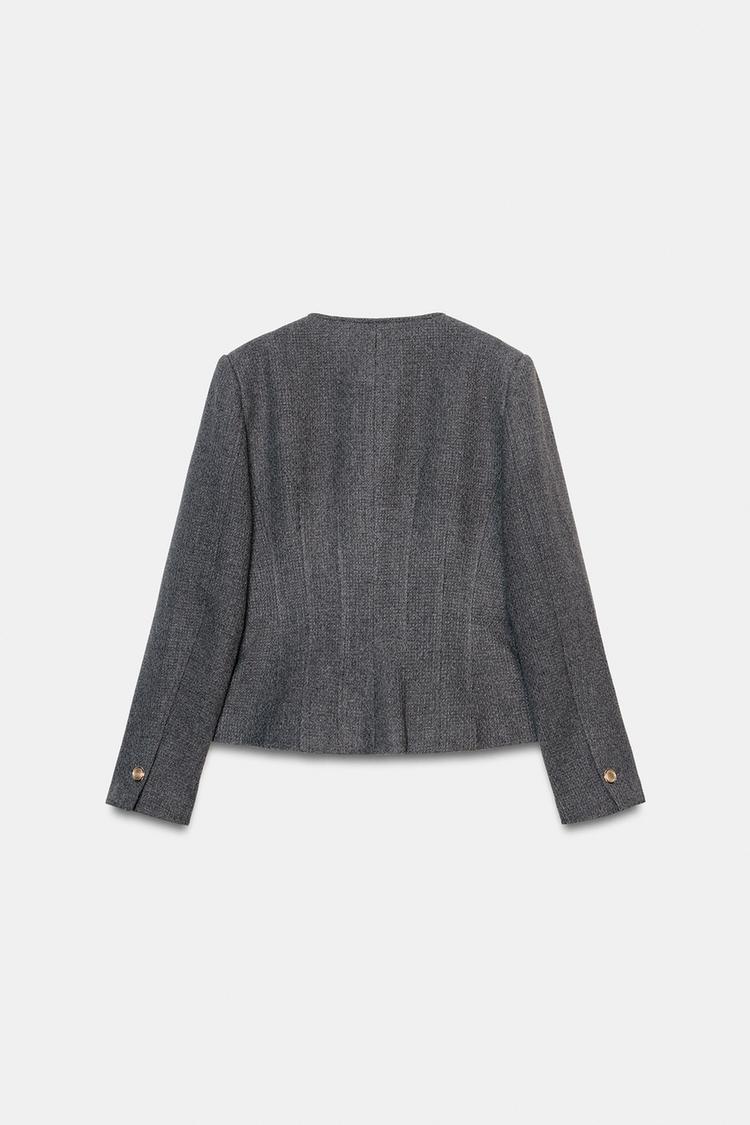 ZARA БЛЕЙЗЕР ОБЛЕГАЮЩЕГО КРОЯ С КРУГЛЫМ ВЫРЕЗОМ, СЕРЫЙ