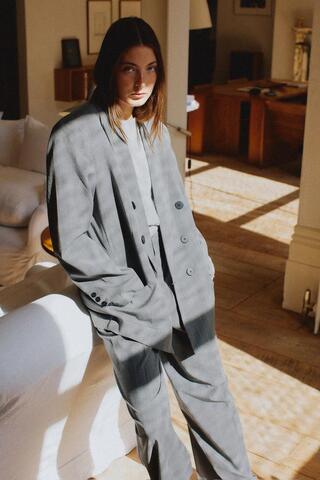 Блейзер оверсайз с воротником с лацканами. Длинные рукава с подплечниками. Передние карманы. Комбинированная подкладка. Двубортная застежка на пуговицы.