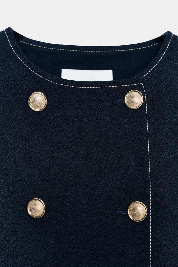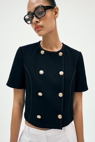 Блейзер с круглым вырезом и короткими рукавами. Контрастная строчка. Двубортная застежка на пуговицы.