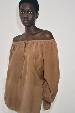 Блуза из льна (34%). Прямой вырез с открытыми плечами и завязками. Длинные объемные рукава на резинке. Прямой низ.
