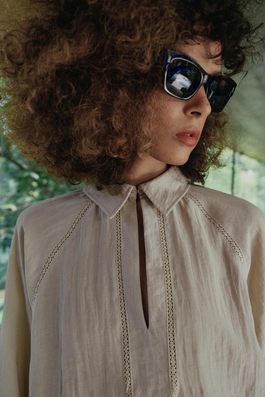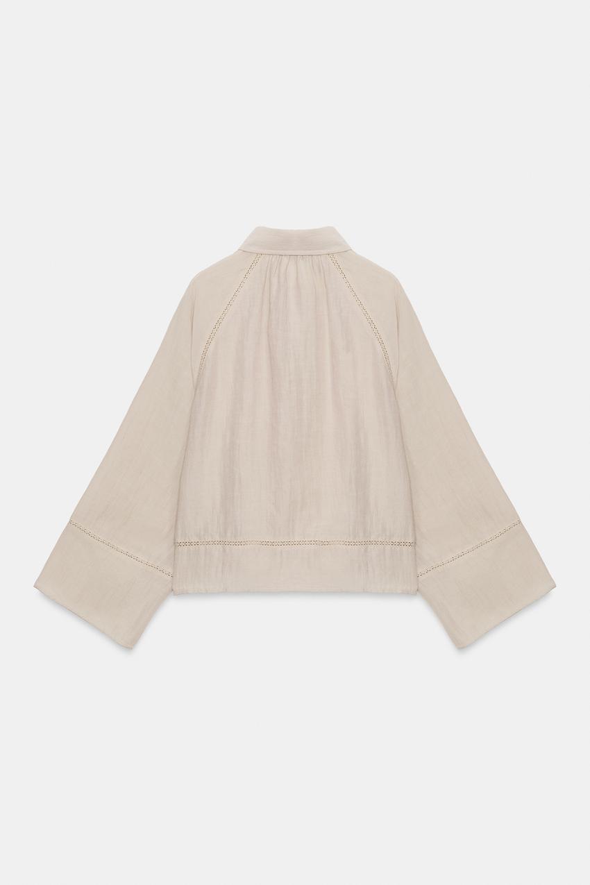ZARA БЛУЗА ИЗ НАТУРАЛЬНОЙ ТКАНИ С КРУЖЕВОМ, СВЕТЛО-БЕЖЕВЫЙ