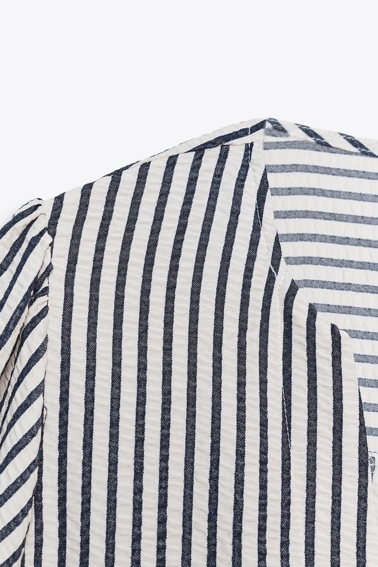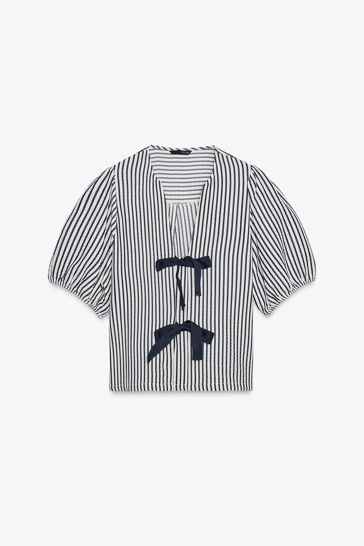 ZARA БЛУЗА ЛЬНЯНАЯ С ЗАВЯЗКАМИ, ЭКРЮ/ТЕМНО-СИНИЙ